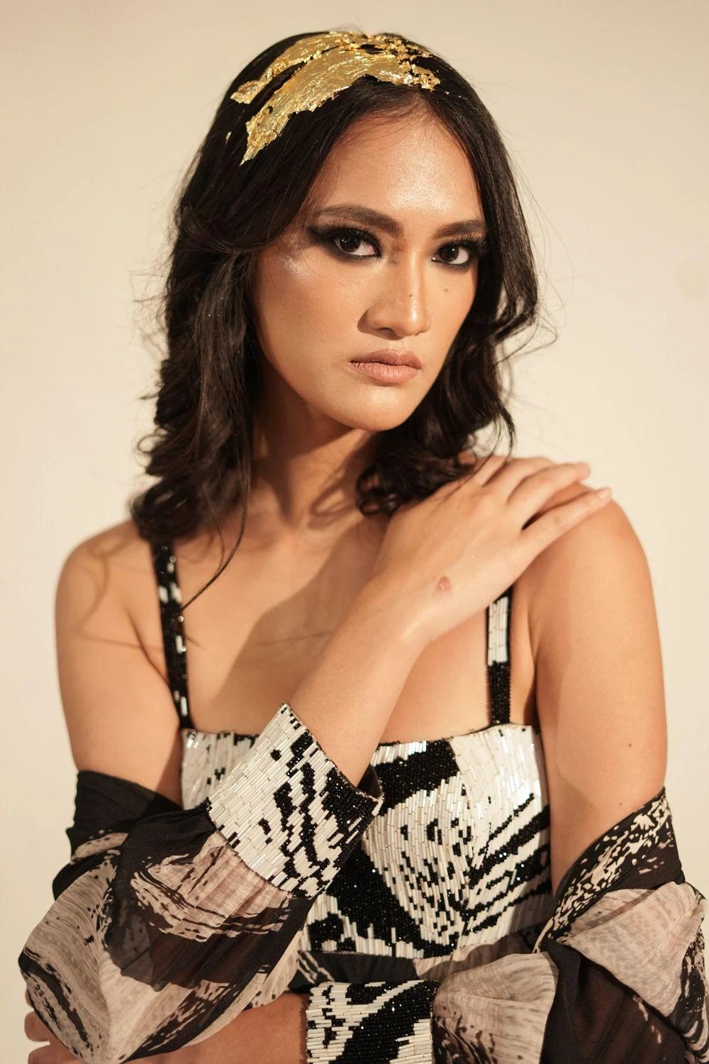 Elevate your style with this black & white stroke print jumpsuit. Adorned with glass bead embellishments, it’s a fusion of chic and sophistication, making a bold statement in monochrome elegance.