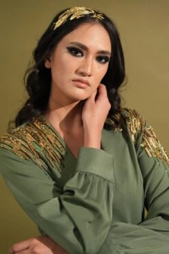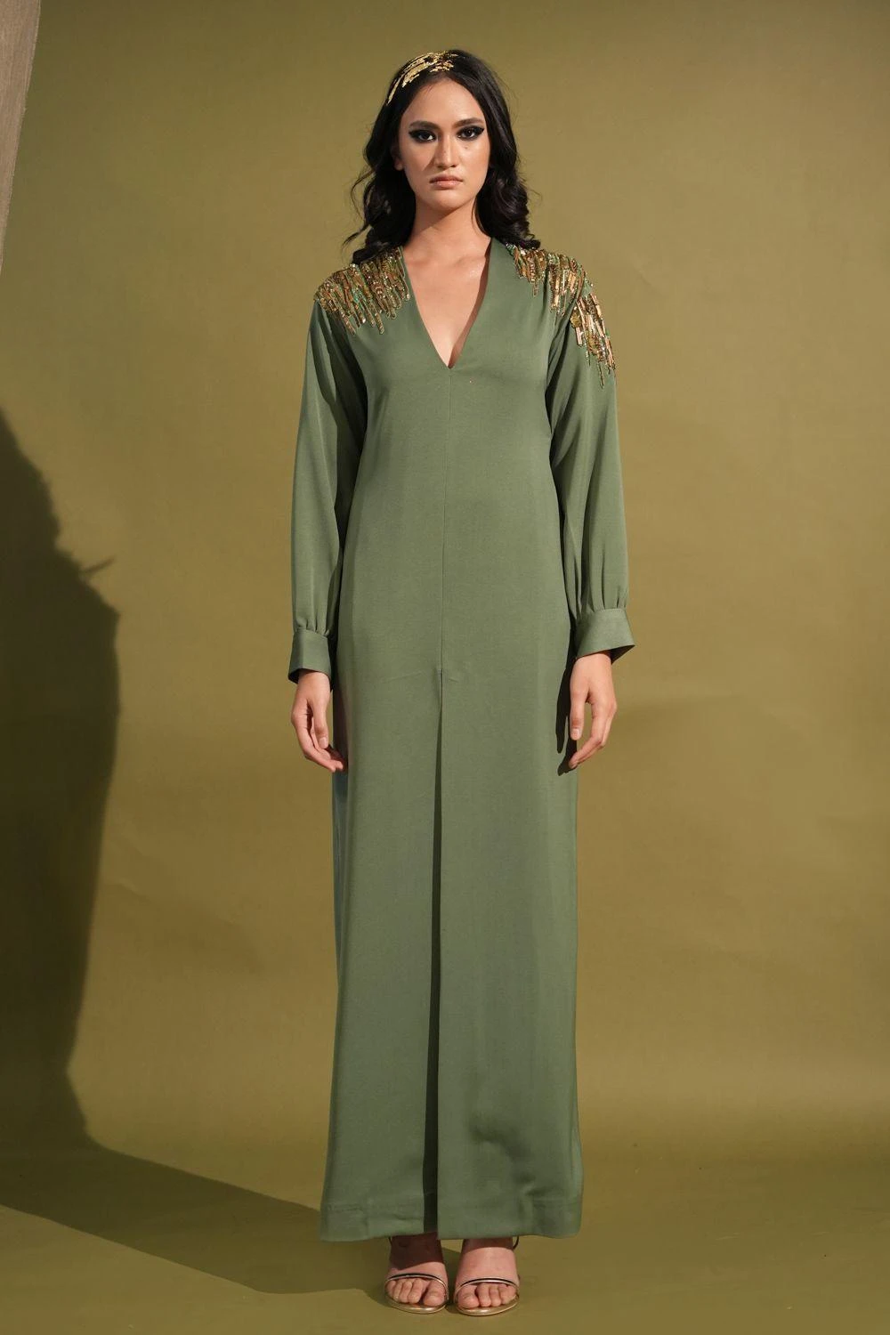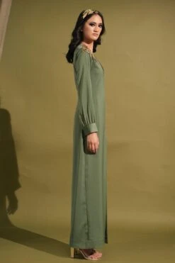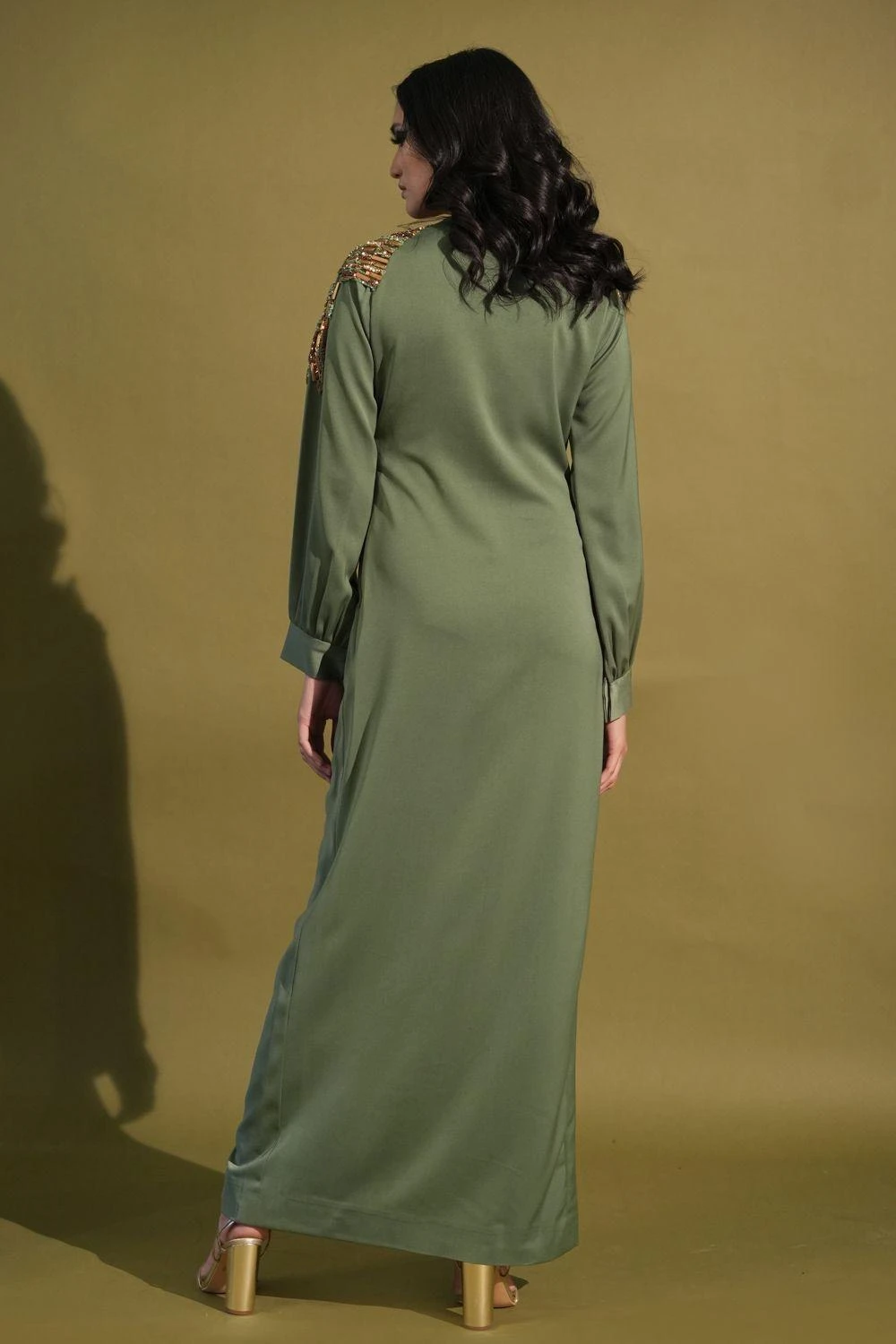 Indulge in allure with this Dark Jade Dress featuring a tantalizing slit and metallic gold embellishments. This opulent piece promises elegance and sophistication for your special occasions.