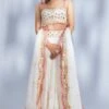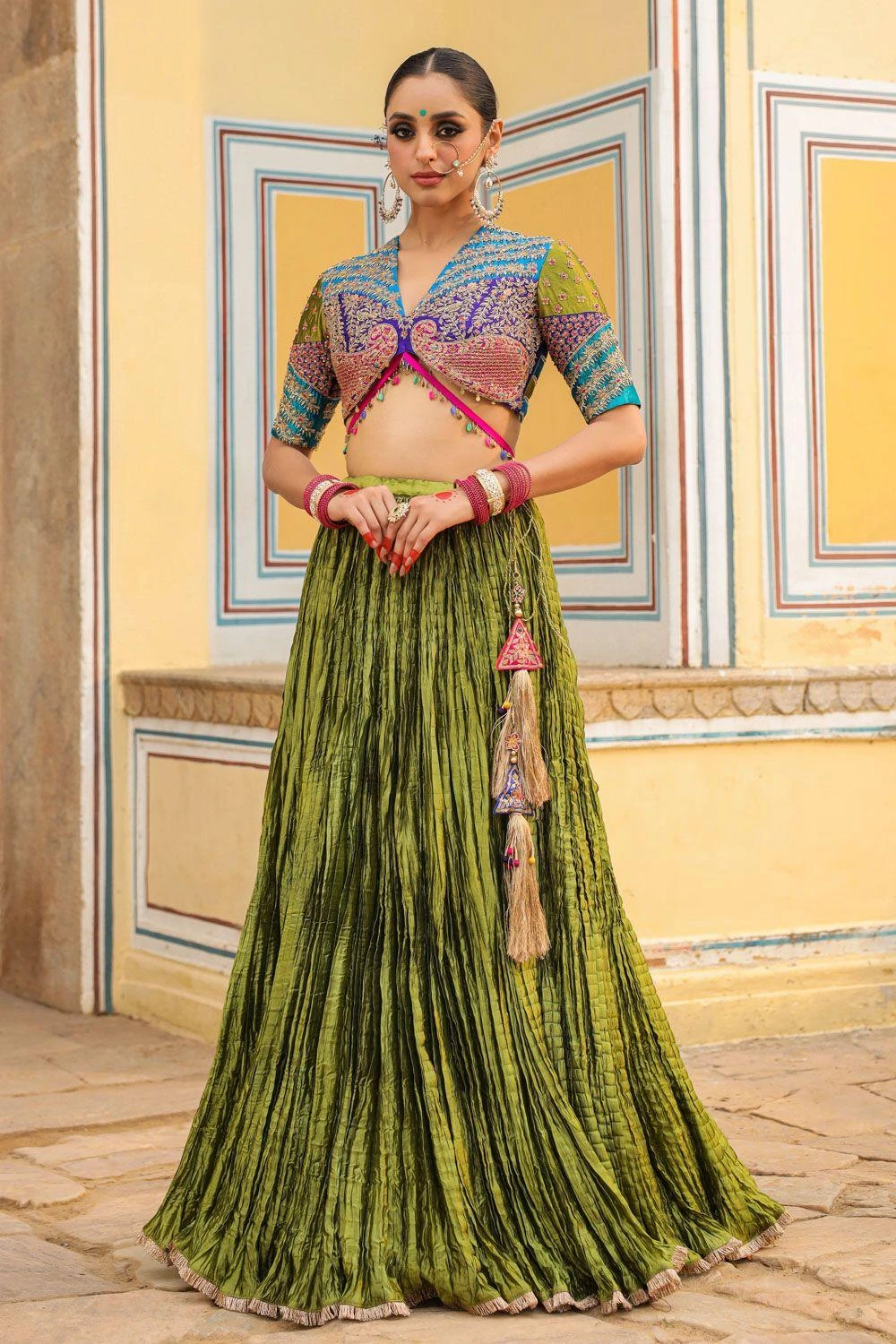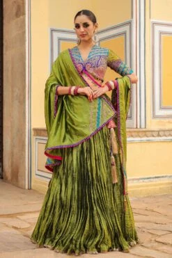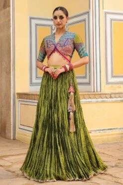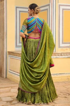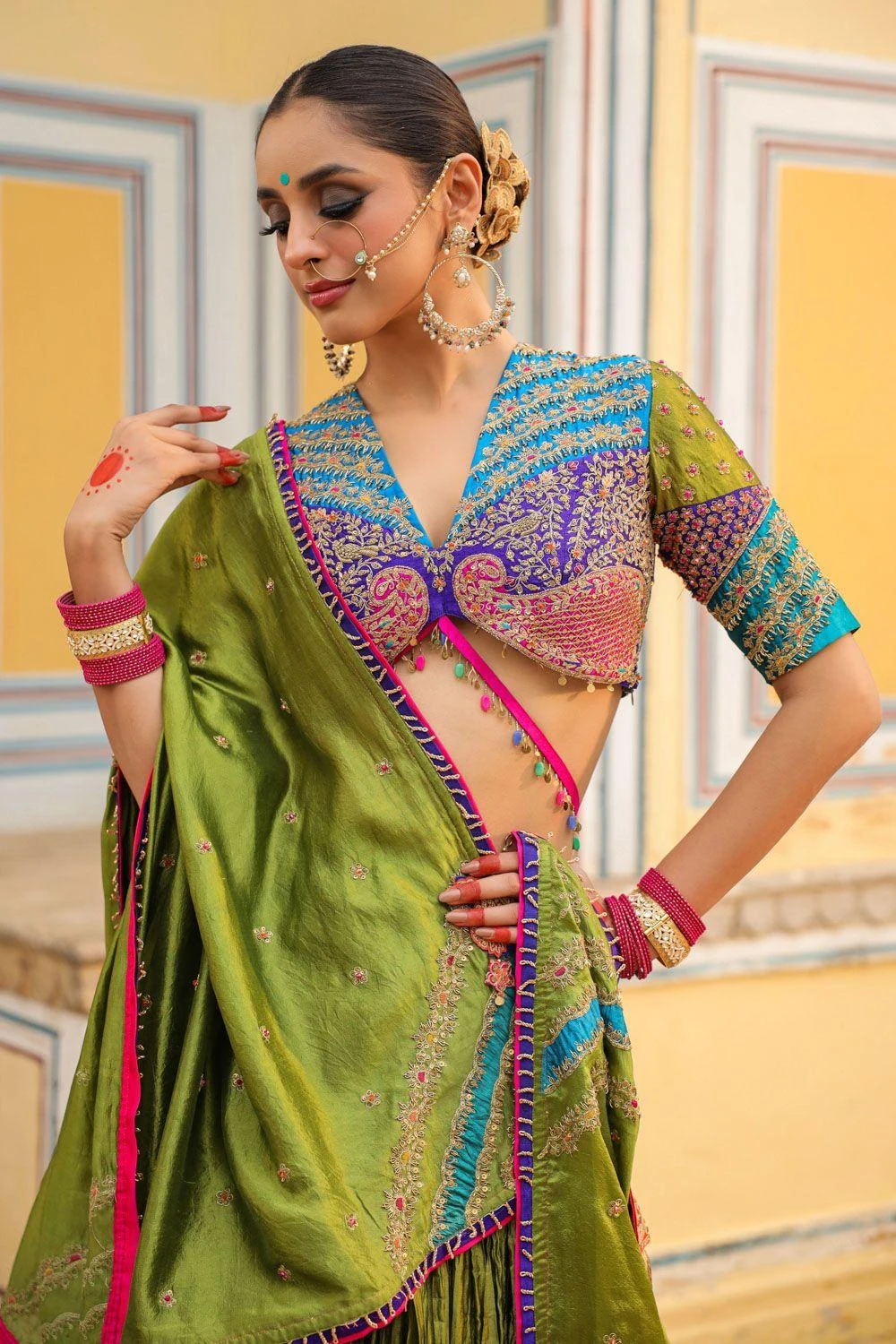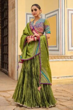 Elevate elegance with this 3-piece silk lehenga set. The meticulously embroidered zari dori blouse, adorned with resham & tikkis, pairs exquisitely with the intricately detailed dupatta with lace and latkans & a crushed lehenga with handmade latkans.