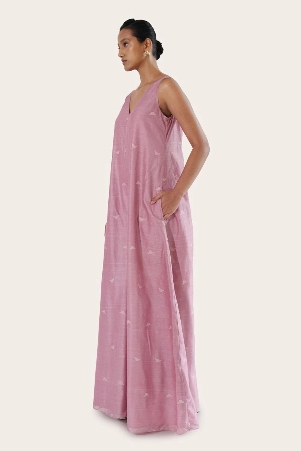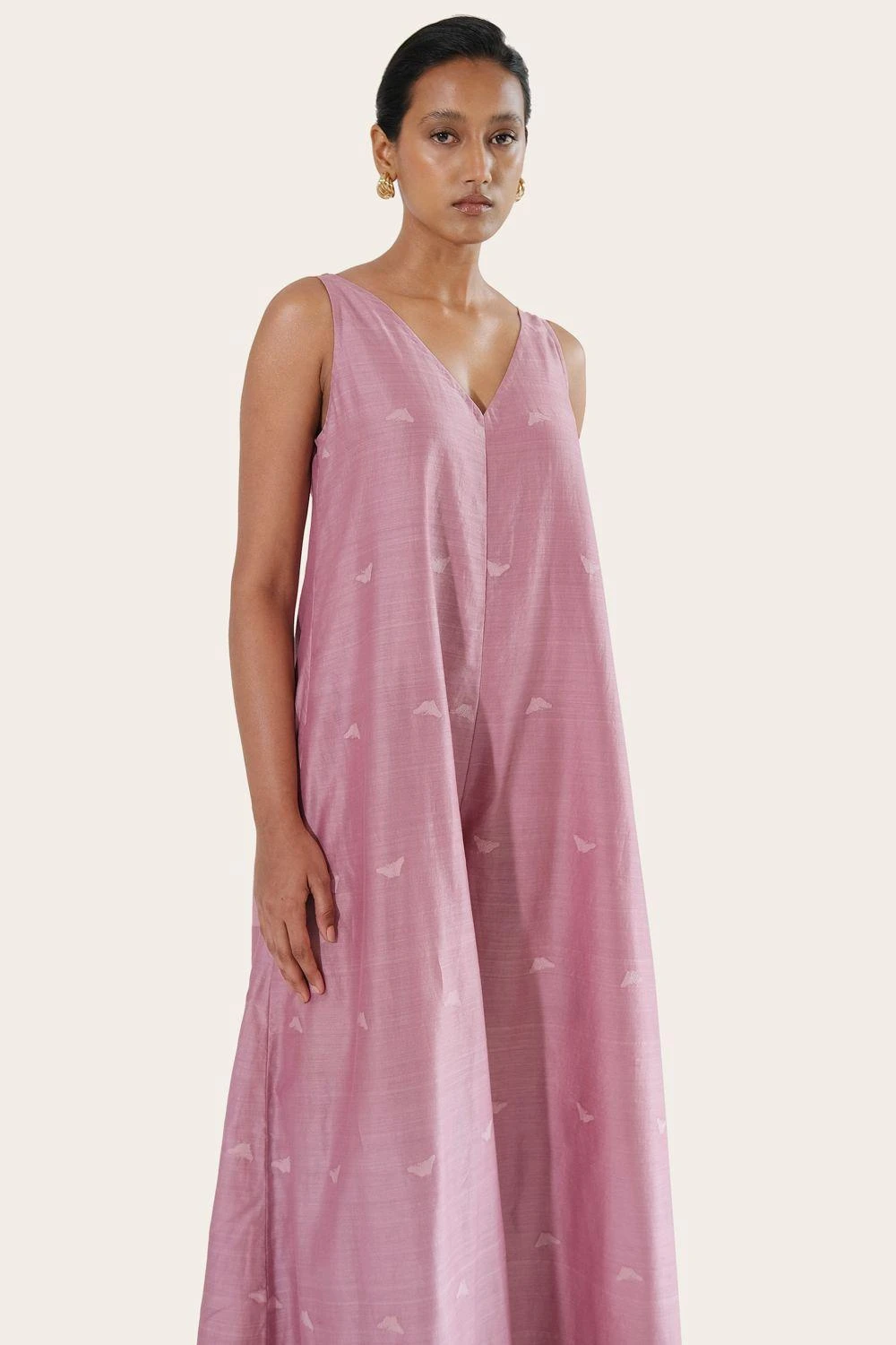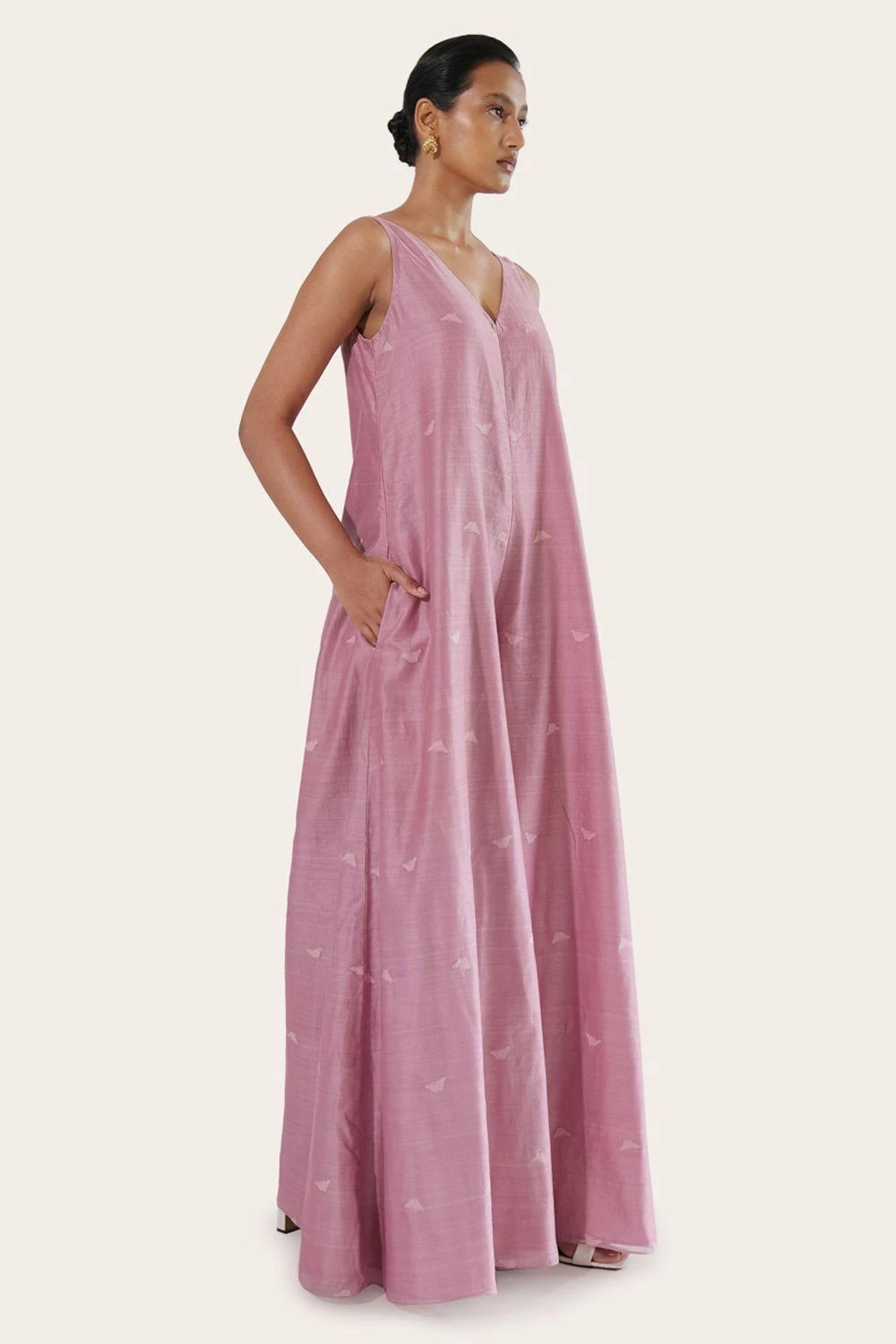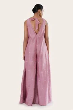 Elevate your vacation and city style with this jumpsuit crafted from handwoven chanderi silk. Adorned with resham jamdani work, it features a flattering V-neckline and flowy wide legs, making it a versatile addition to your wardrobe.