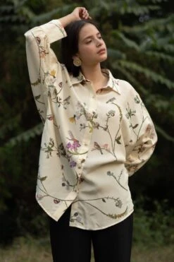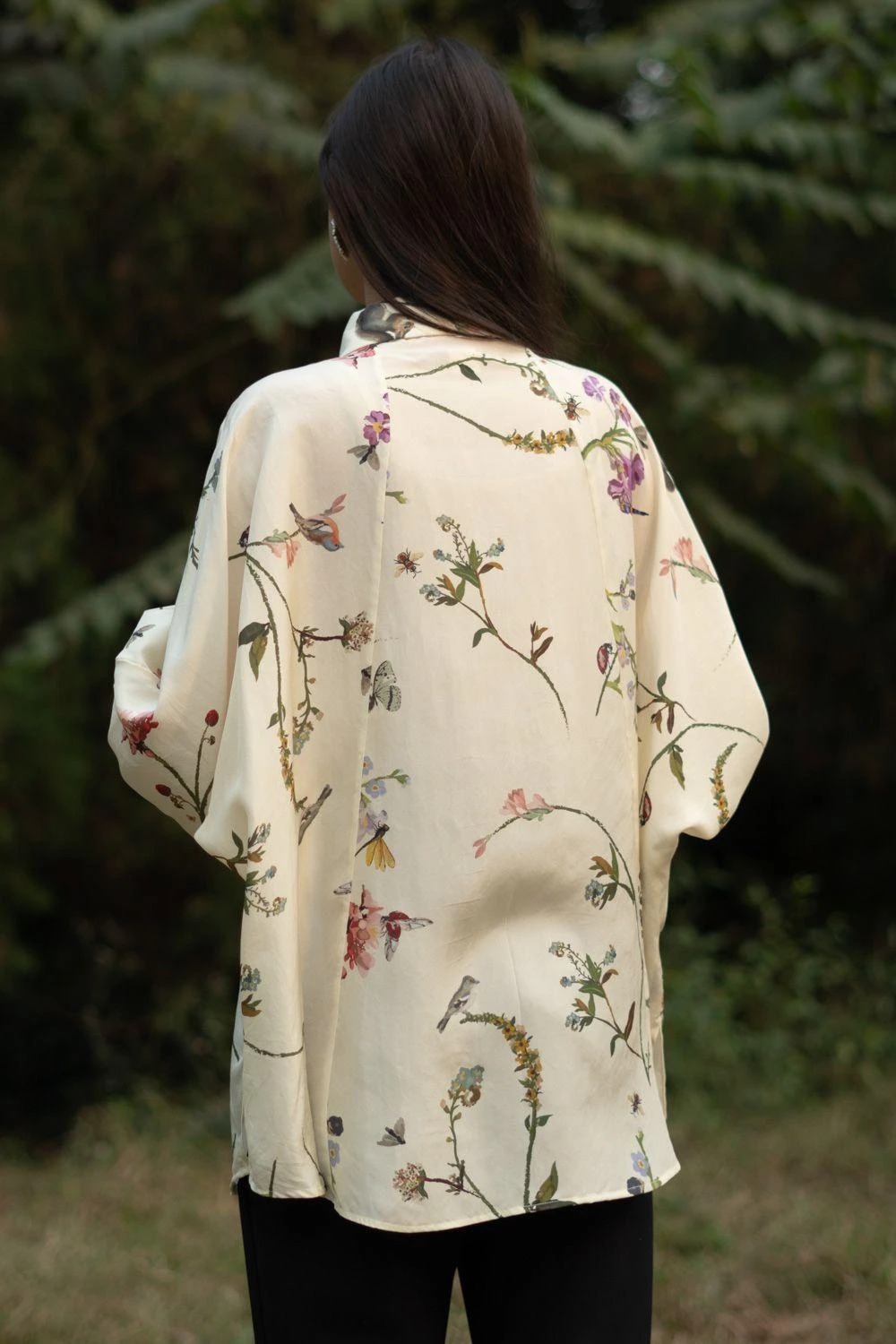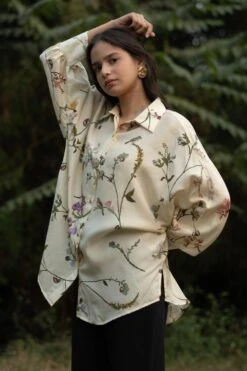 In the tapestry of elegance, the oversized silk shirt unfoldsùa canvas of artistry, adorned with signature brass buttons. Dolman sleeves embrace chic comfort. An enchanting choice for outings & leisurely brunches. Elevate your moments with grace.