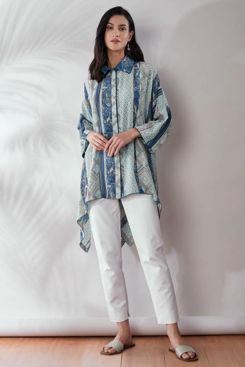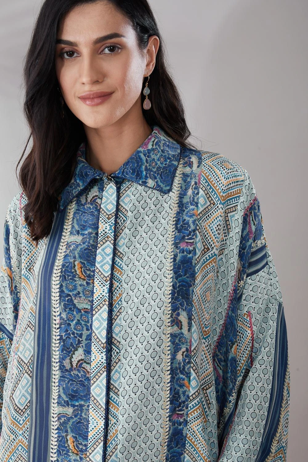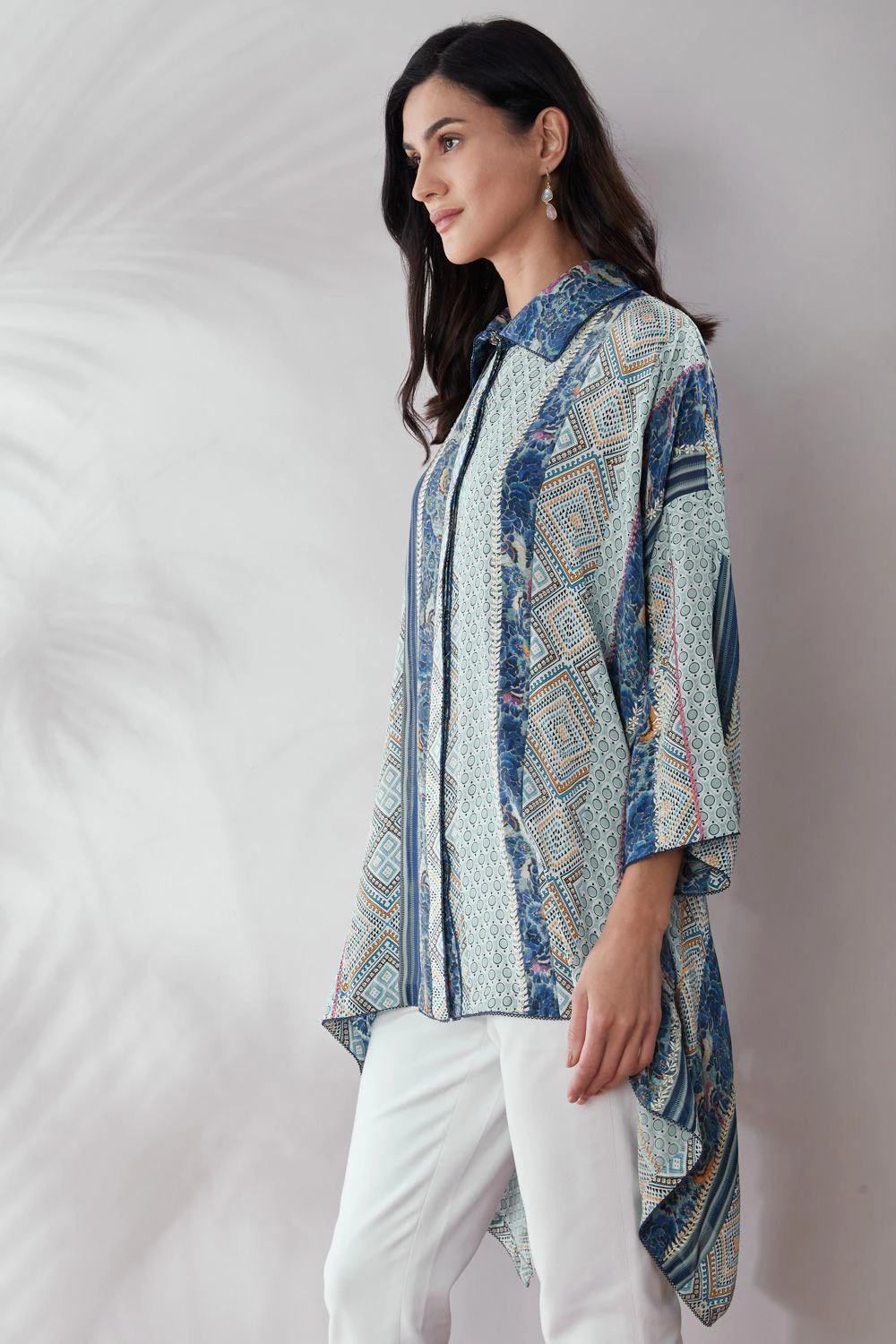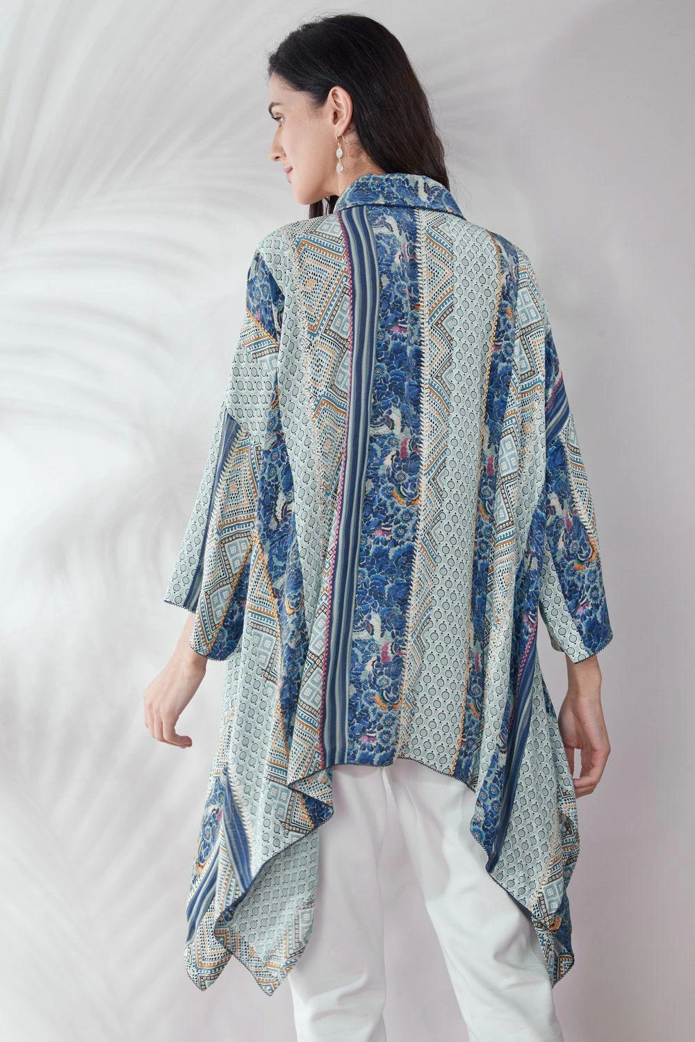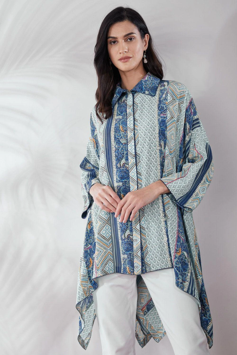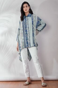 This patchwork asymmetric shirt is a great pick to go from day to evening in style & comfort. It is cut in silk crepe and enhanced with gara machine & hand embroidery. You can style it with a pair of white denims & gold hoops to complete your look.