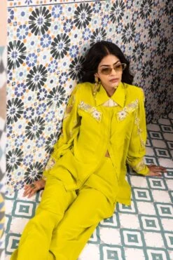 Elevate your wardrobe with this Lush Lime Parsi Gara Shirt. Intricately thread embroidered using delicate techniques like French knots and bullion knots, adorned with ivory katdana accents.