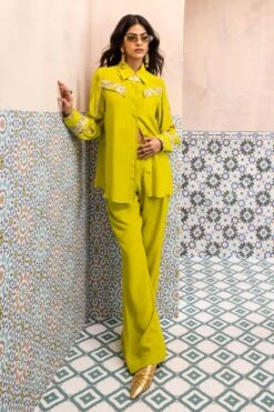 Elevate your wardrobe with this Lush Lime Parsi Gara Shirt. Intricately thread embroidered using delicate techniques like French knots and bullion knots, adorned with ivory katdana accents.