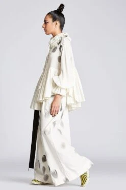 This striking pink long kurta set in silk georgette is adorned with floral gara embroidery. The kurta is paired with silk crepe straight pants with lace detailing. This stylish set is perfect for an intimate soiree, or an outdoor party.