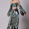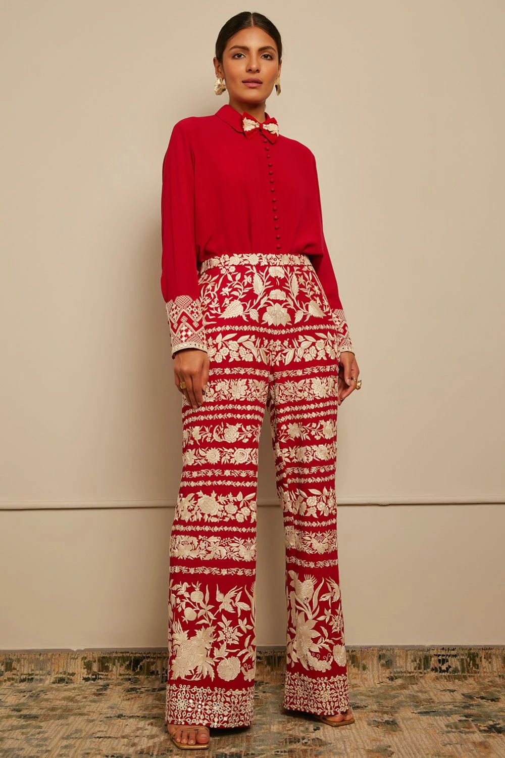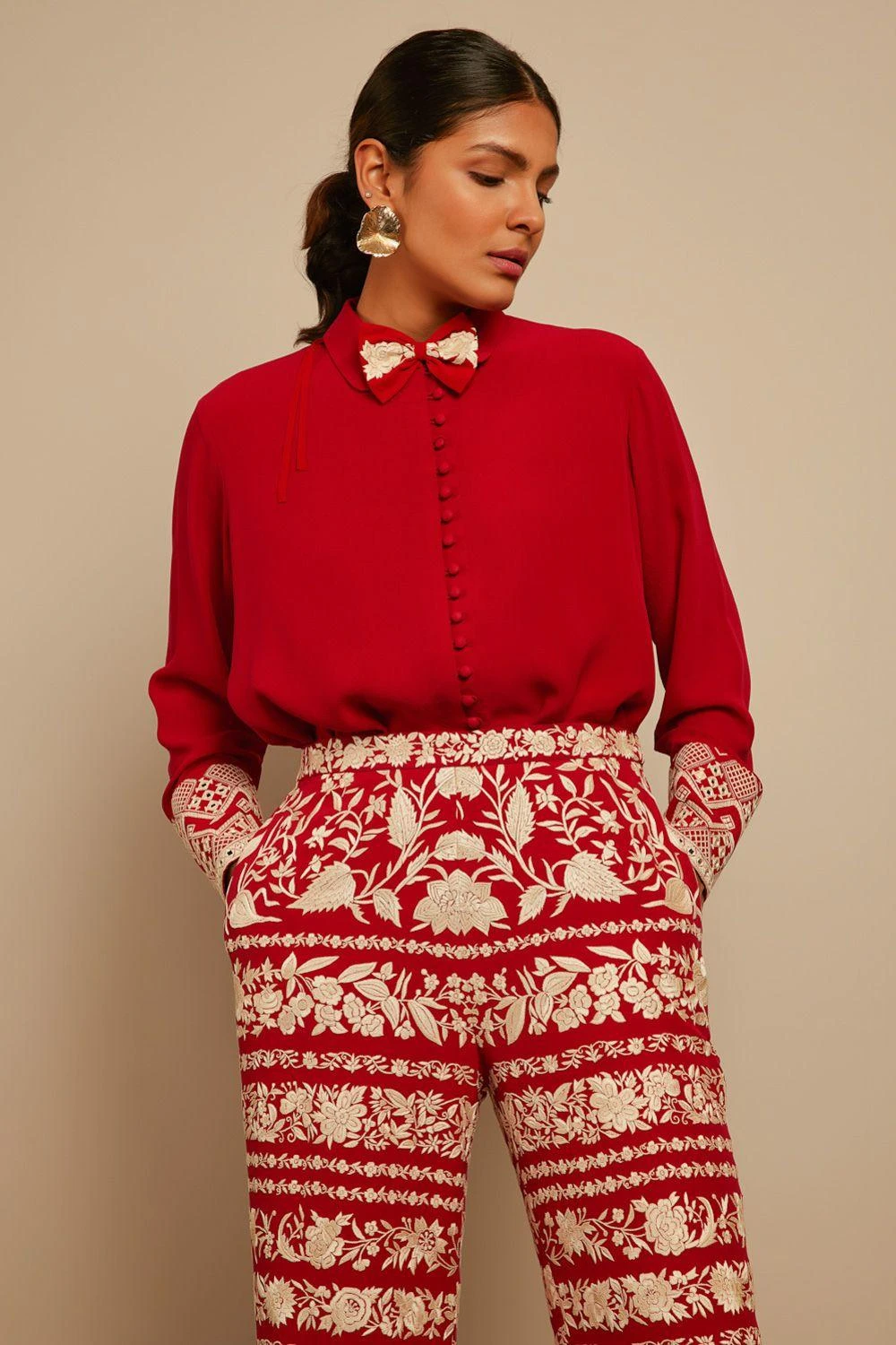 Minimalism & elegance takes the center stage with this ruby red shirt woven in smooth & sheen silk georgette. It is adorned with hand thread embroidery & mirror work on the cuff of the sleeves. Team it up with a pair of tailored ivory pants.