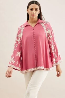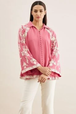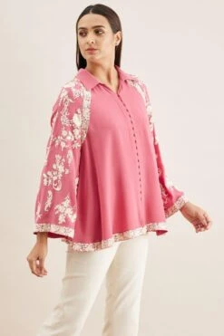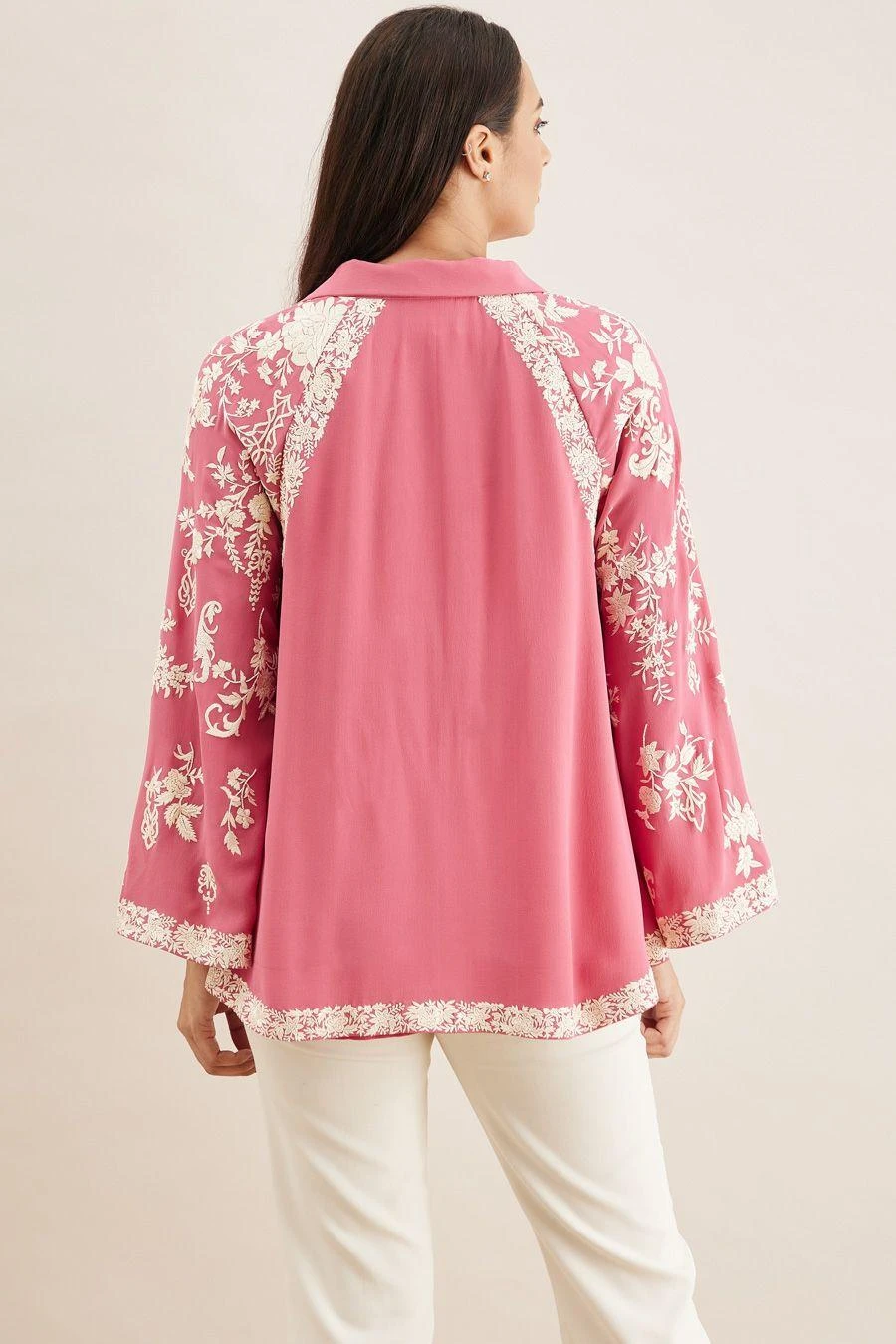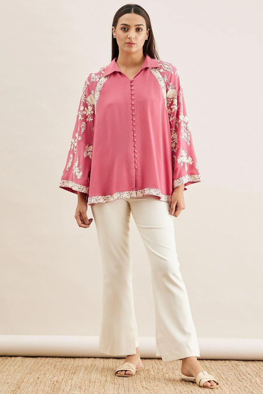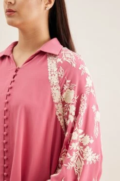 The perfect amalgamation of style & comfort, this salmon shirt is perfect for a day out. Crafted in georgette, this shirt features classic gara thread embroidered details. Pair it with white flared trousers & dainty jewellery to complete the look.