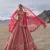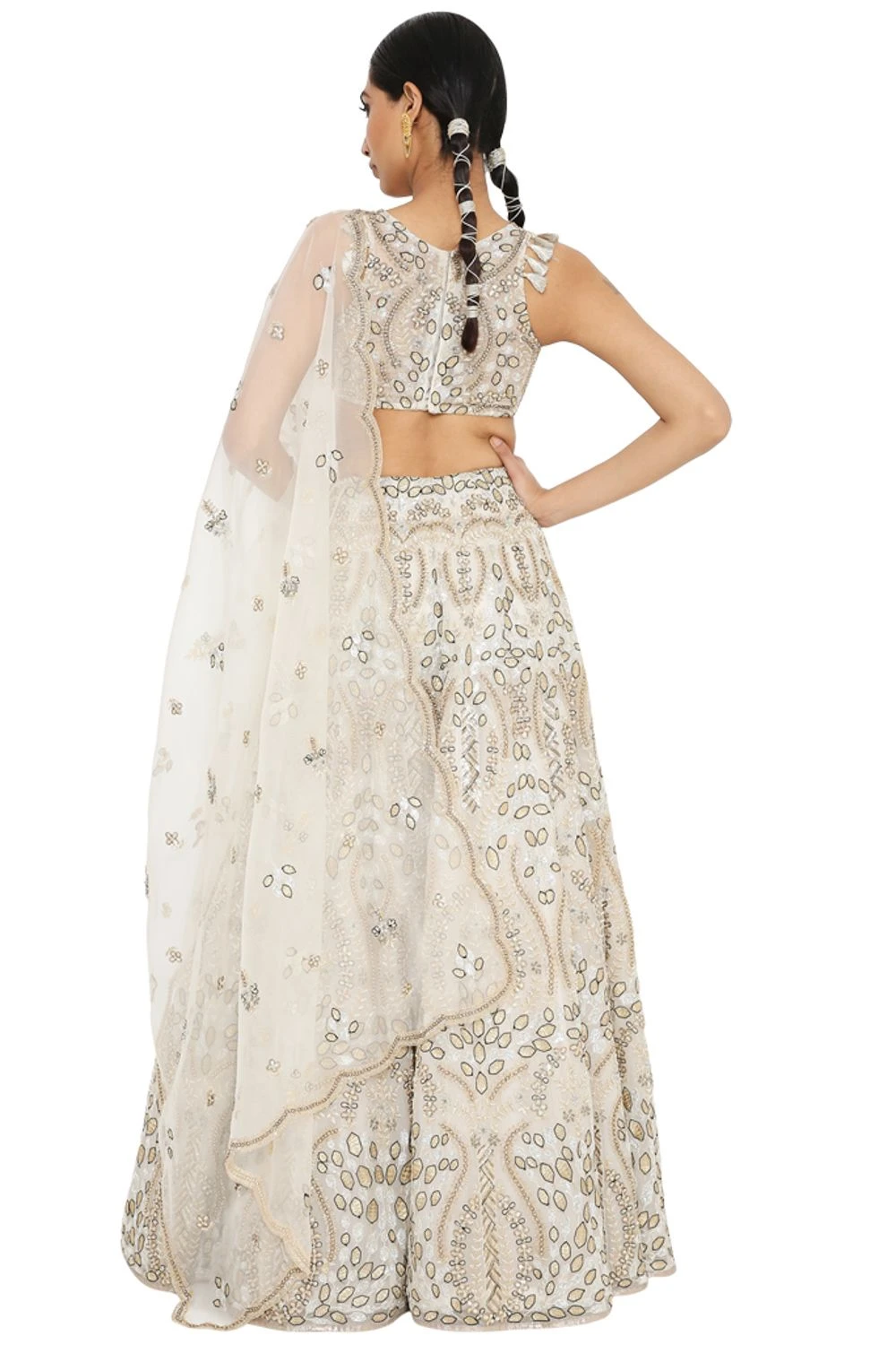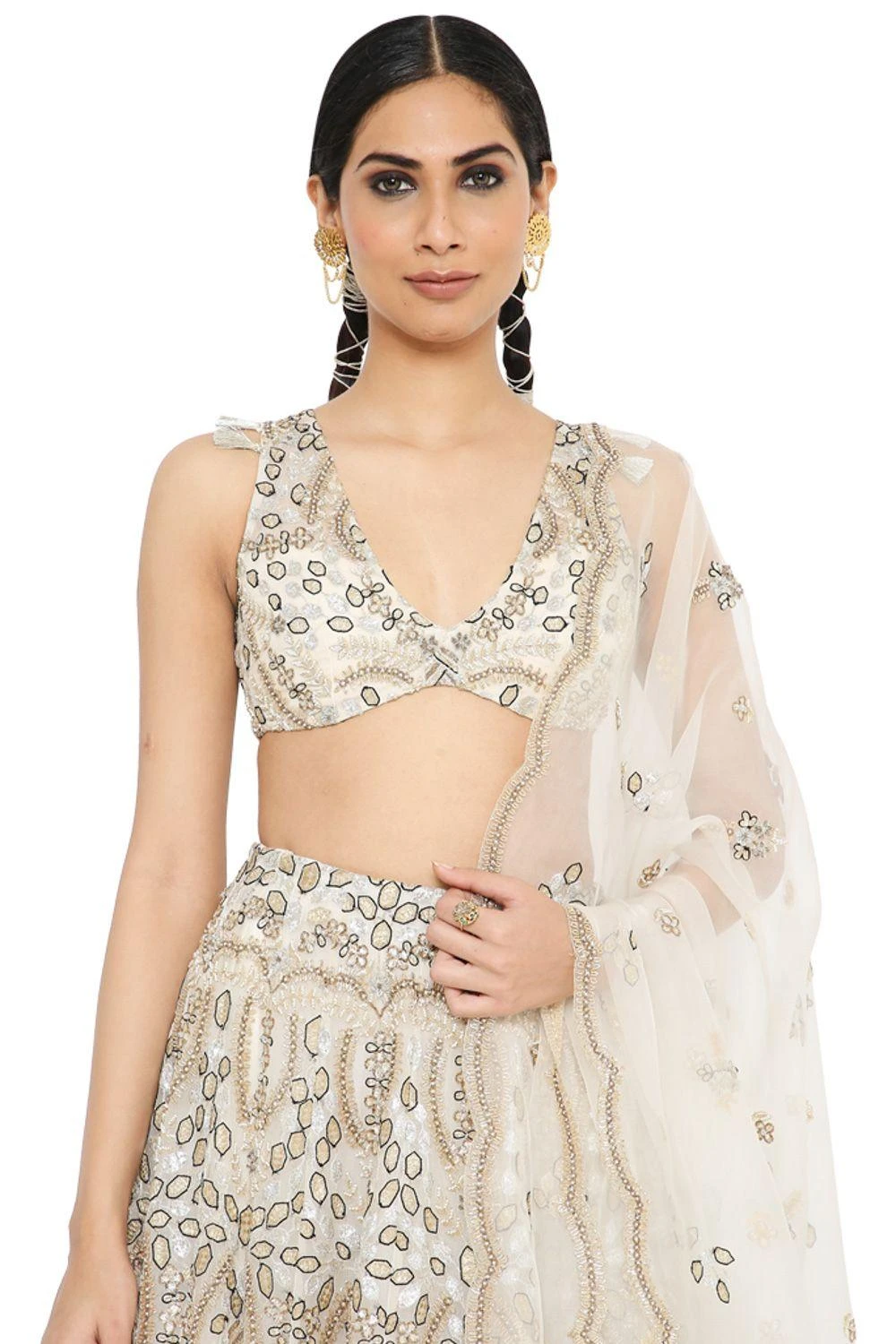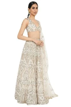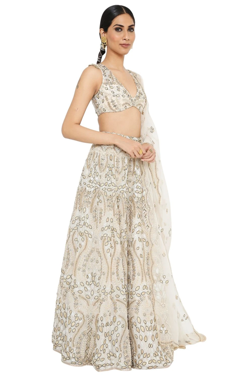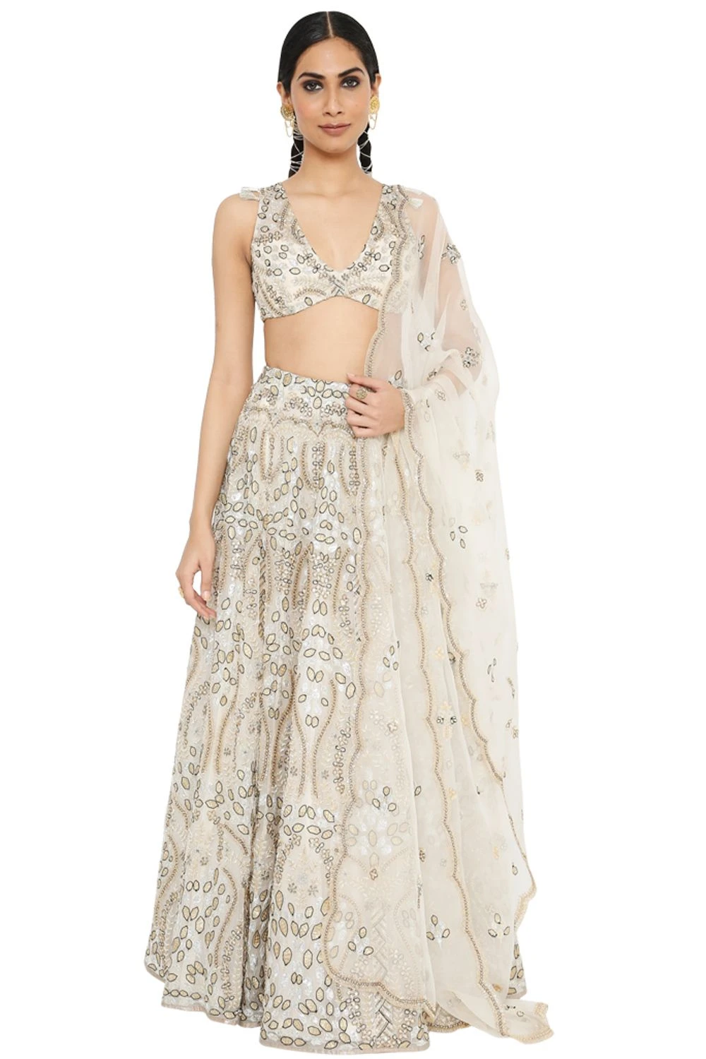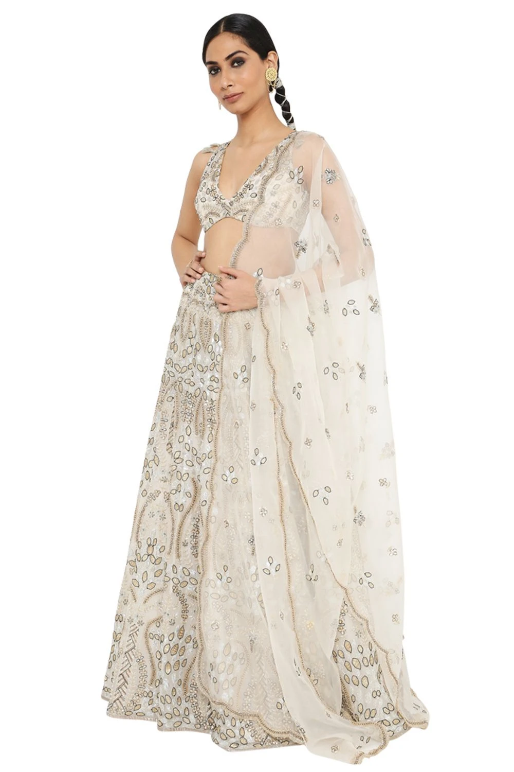 This ethereal off white lehenga is cut in an airy organza fabric. The delicate embroidery on this piece adds a regal element to this romantic style. Pair this lehenga set with a choker & jhumkas for summer daytime wedding festivities.