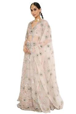Ditch the traditional lehenga sets on your big day for this one of a kind rose pink lehenga set. It is set in organza base and adorned with intricate embroidery details all over. The set comes with an organza embroidered dupatta.