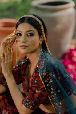 The perfect amalgamation of style & comfort, this lehenga set works across occasions. Crafted in velvet, this set features an aari embroidered lehenga & blouse paired with an organza dupatta. Add a pair of statement earrings to complete the look.