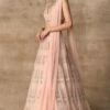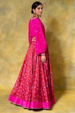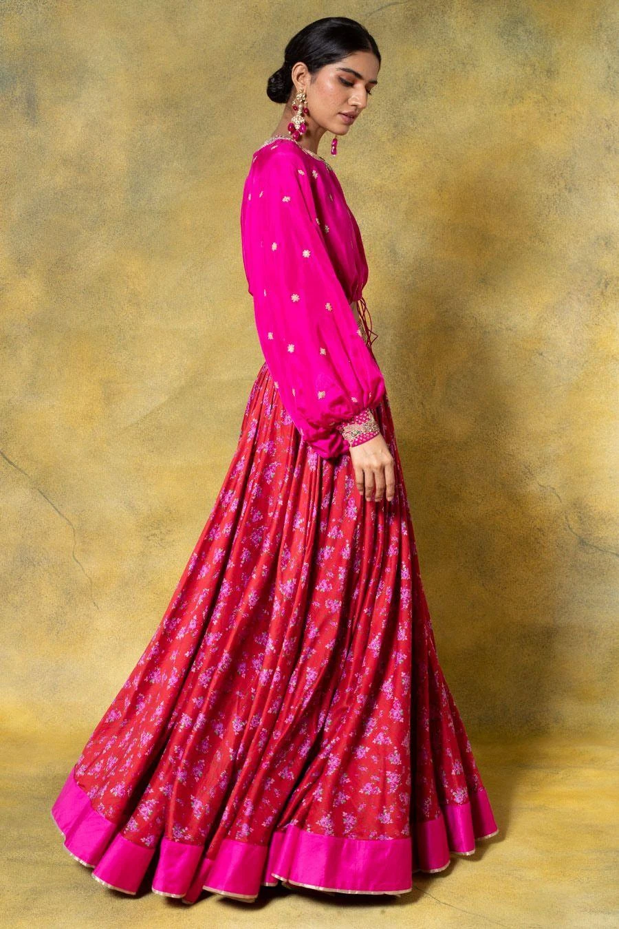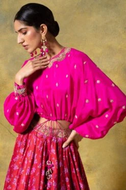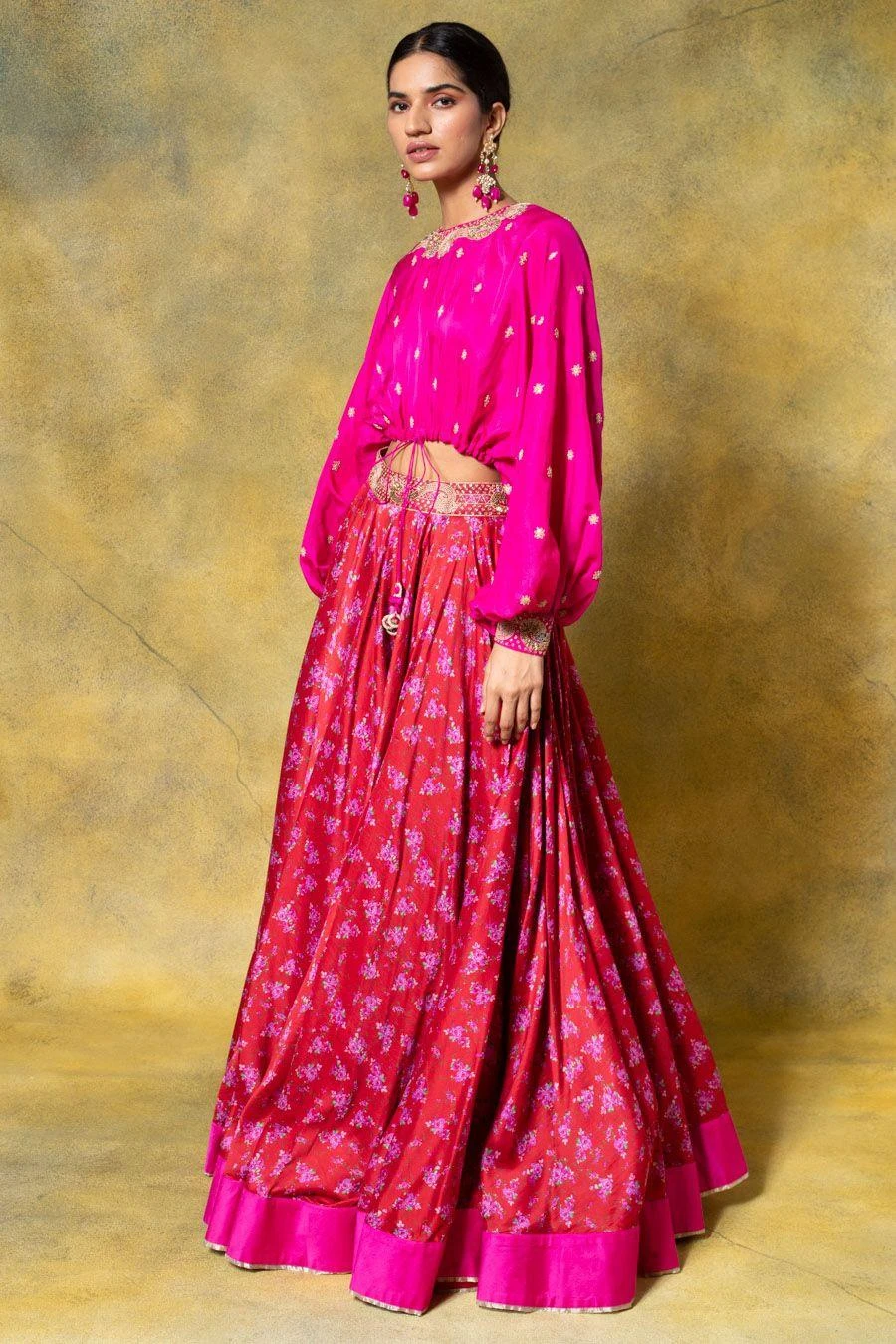Punit Balana’s runway collection inspired by the Kalbelia dance harmoniously embodies its playfulness & regality. Crafted in silk, this set features a kaftan style marodi work top paired with a floral hand embellished lehenga.