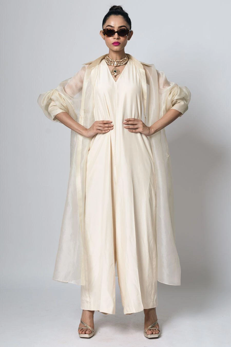 Add a layer of statement & glamour to your resort getaways with this set. Crafted in organza silk, this set features a V-neck jumpsuit paired with a long shirt. Add a pair of statement earrings to complete the look.