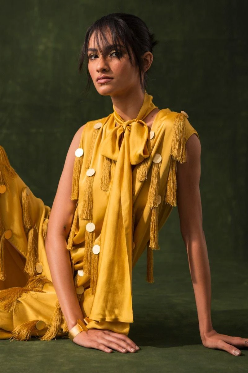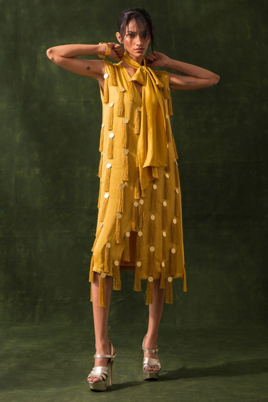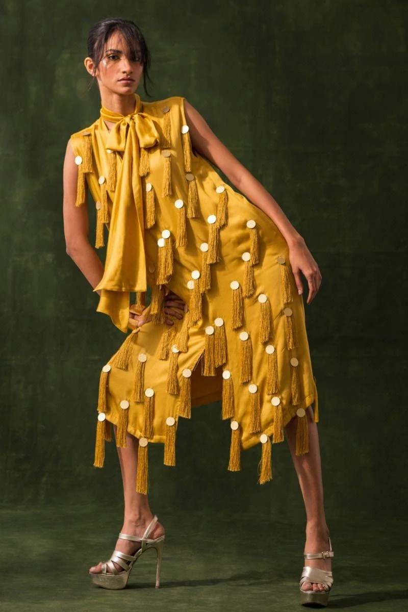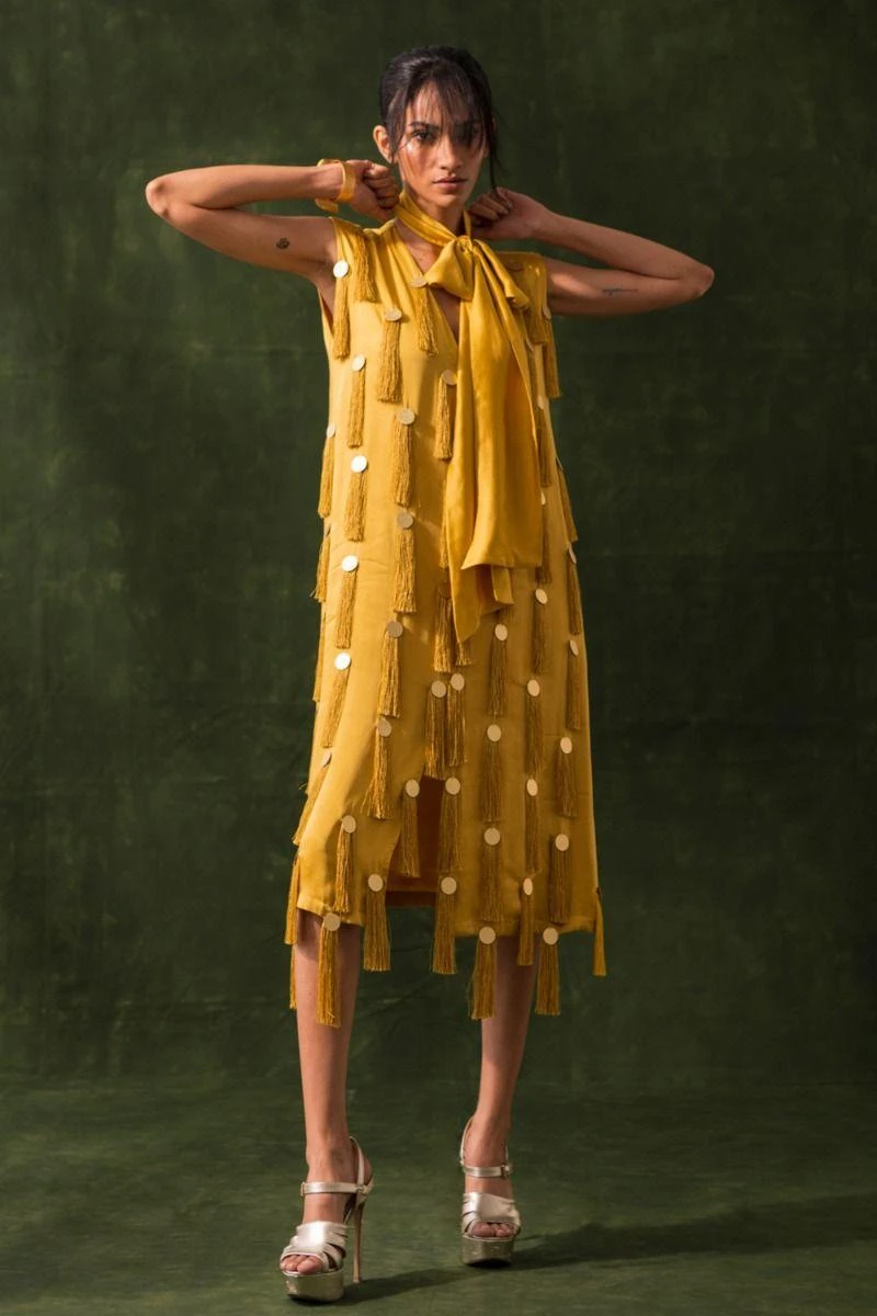 Whizz from the boardroom to the bar with this mustard yellow dress. Crafted in satin and taffeta, this dress features bow tie details with tassels all over. Add a pair of statement earrings to complete the look.