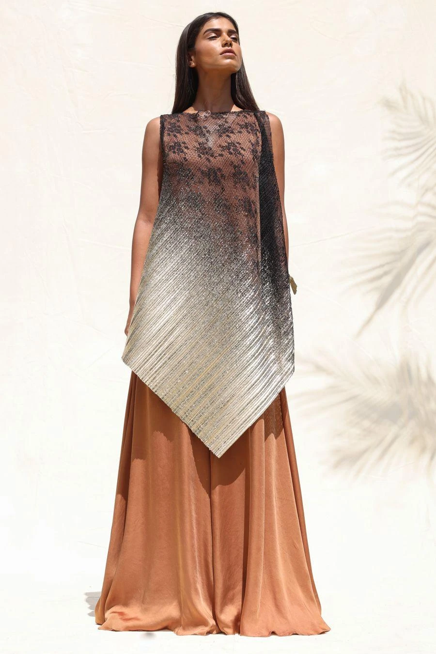 Look effortlessly stylish in this floor length jumpsuit. Crafted in taffeta, this flared jumpsuit comes with a black and gold drape in front. Add an pair of dangler earrings to complete the look.