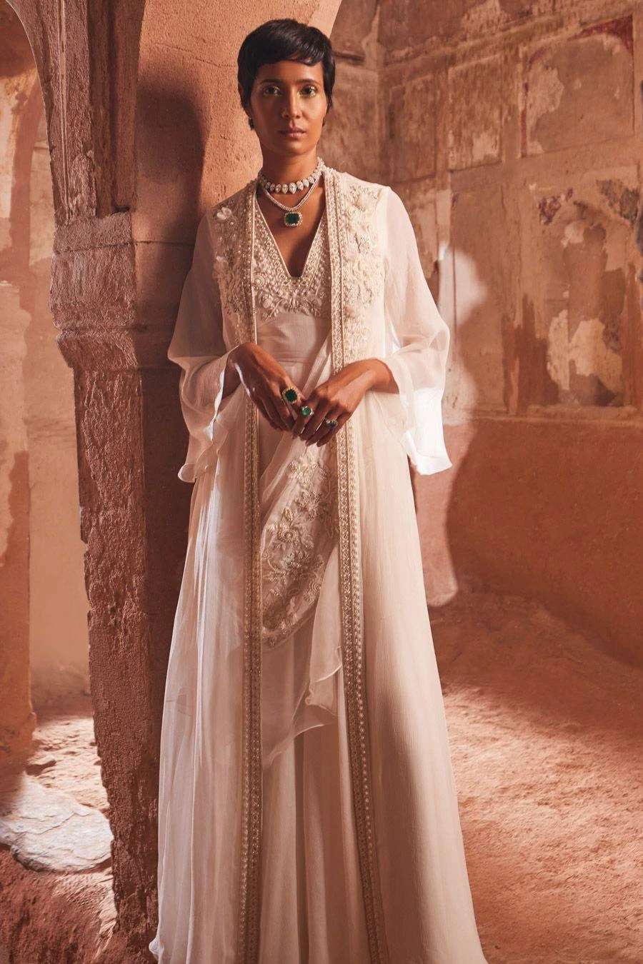 Material/Fabric : Jumpsuit : Chiffon, Jacket : Chiffon, Drape : Chiffon/ organza