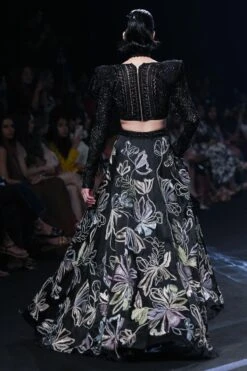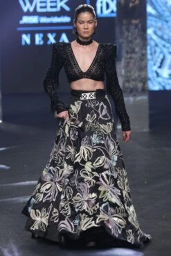 Indulge in luxury with the black geometric cutwork v-neck shoulder pad blouse, paired with a floral lehenga & a geometric clasp belt. This ensemble exudes contemporary charm and sophistication, with its unique design and attention to detail.