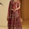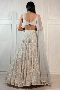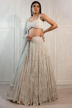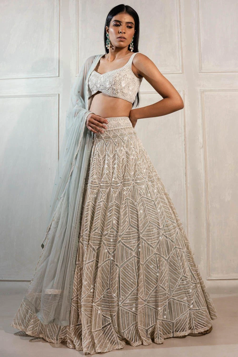 With its contemporary design sensibilities and timeless hues, this green embellished lehenga makes a stunning choice for a new-age bride. It is paired with a matching sleevless blouse and a dupatta.