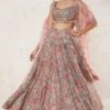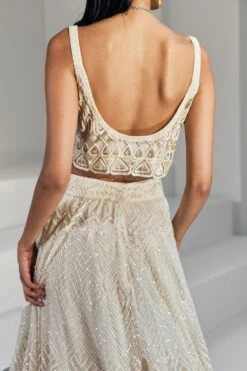 Make the best out of the ivory & gold season with this stunning lehenga. It is intricately embellished with bead, thread, resham & bugle in a web pattern, and comes along with a matching bustier and a dupatta.