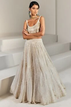 Make the best out of the ivory & gold season with this stunning lehenga. It is intricately embellished with bead, thread, resham & bugle in a web pattern, and comes along with a matching bustier and a dupatta.