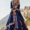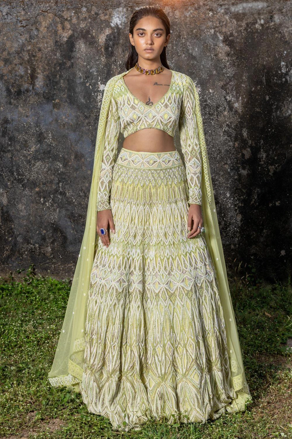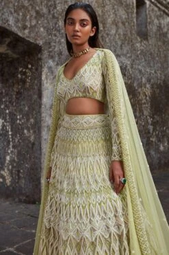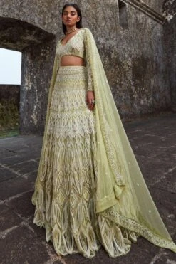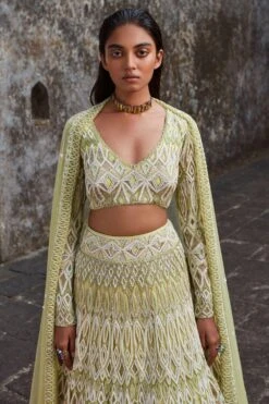 This lime green hand embroidered lehenga set comes with a statement V neck, fitted full sleeve blouse. The heavily embroidered lehenga & ethereal dupatta make for a graceful & elegant set.