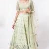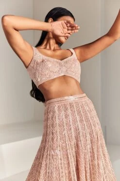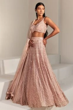 Every detail of this rose pink lehenga reflects a soft & romantic glamour. It is set in a net base with hand embroidery details in a web design, It is paired with a matching blouse and a bordered dupatta.