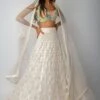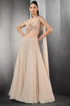 With the right amount of shimmer and sparkle, this lehenga is an apt choice for an evening celebration. Crafted in tulle & georgette, this set features a handcrafted, beaded lehenga with a fringed blouse & an attached dupatta.