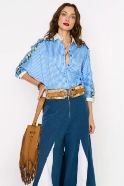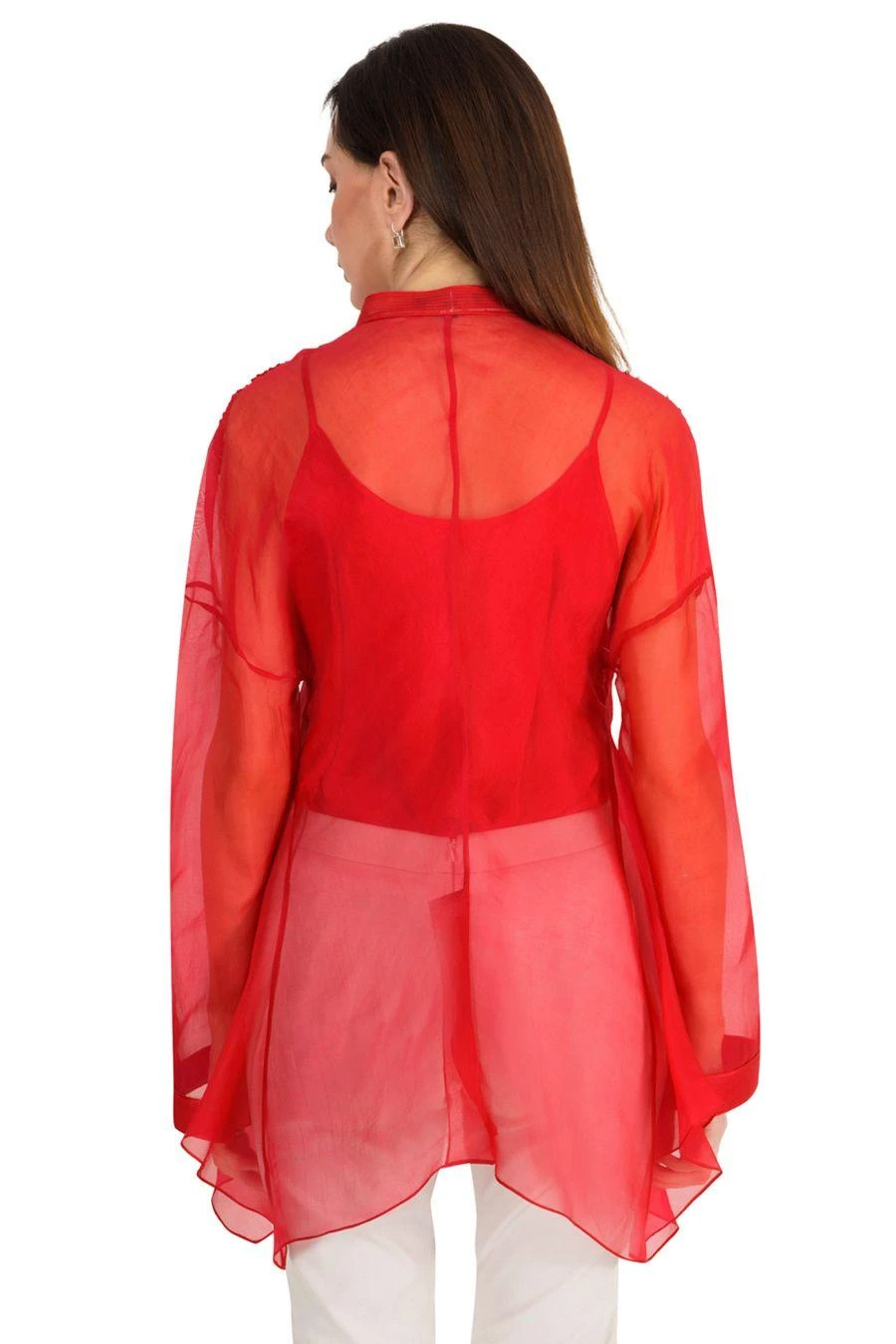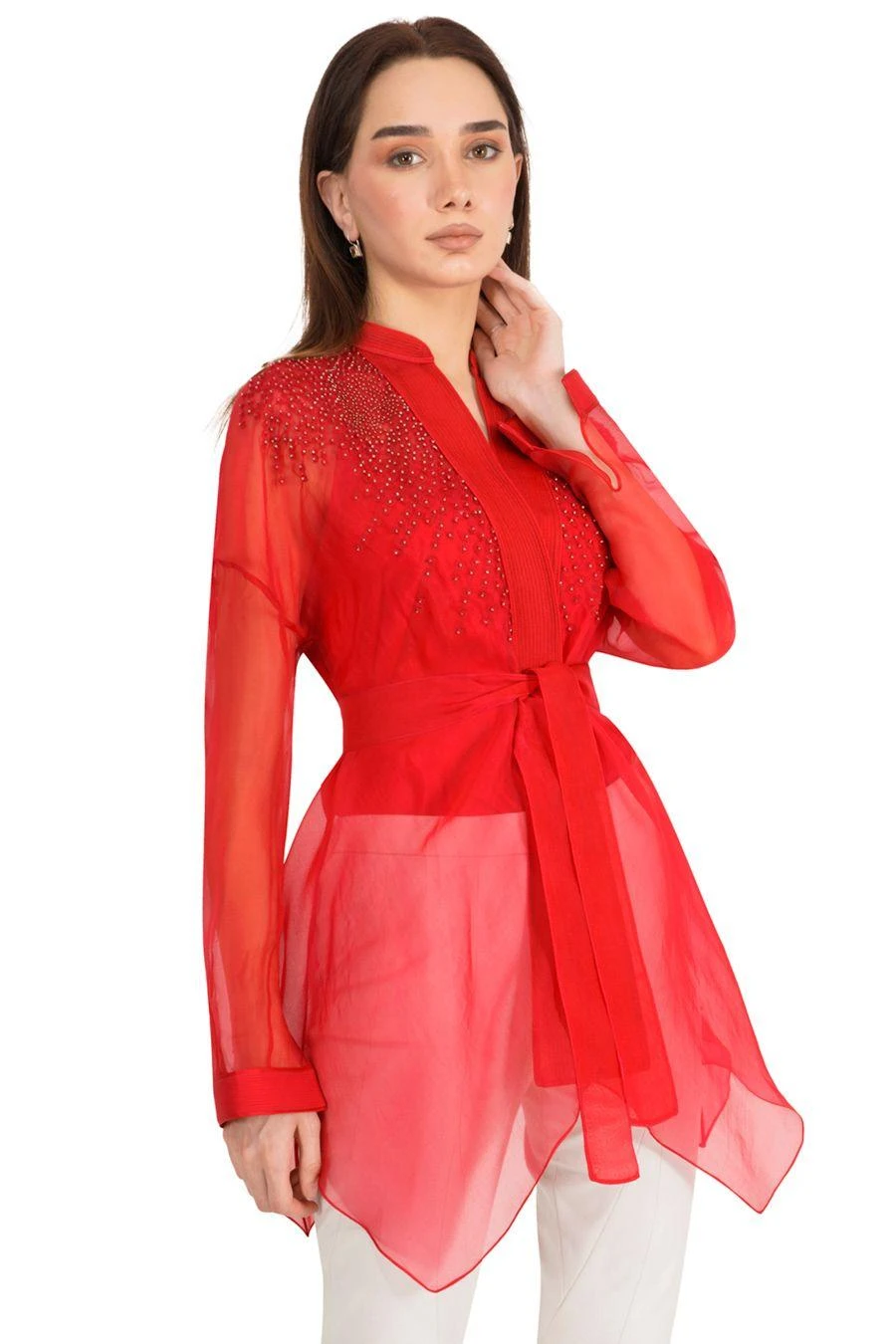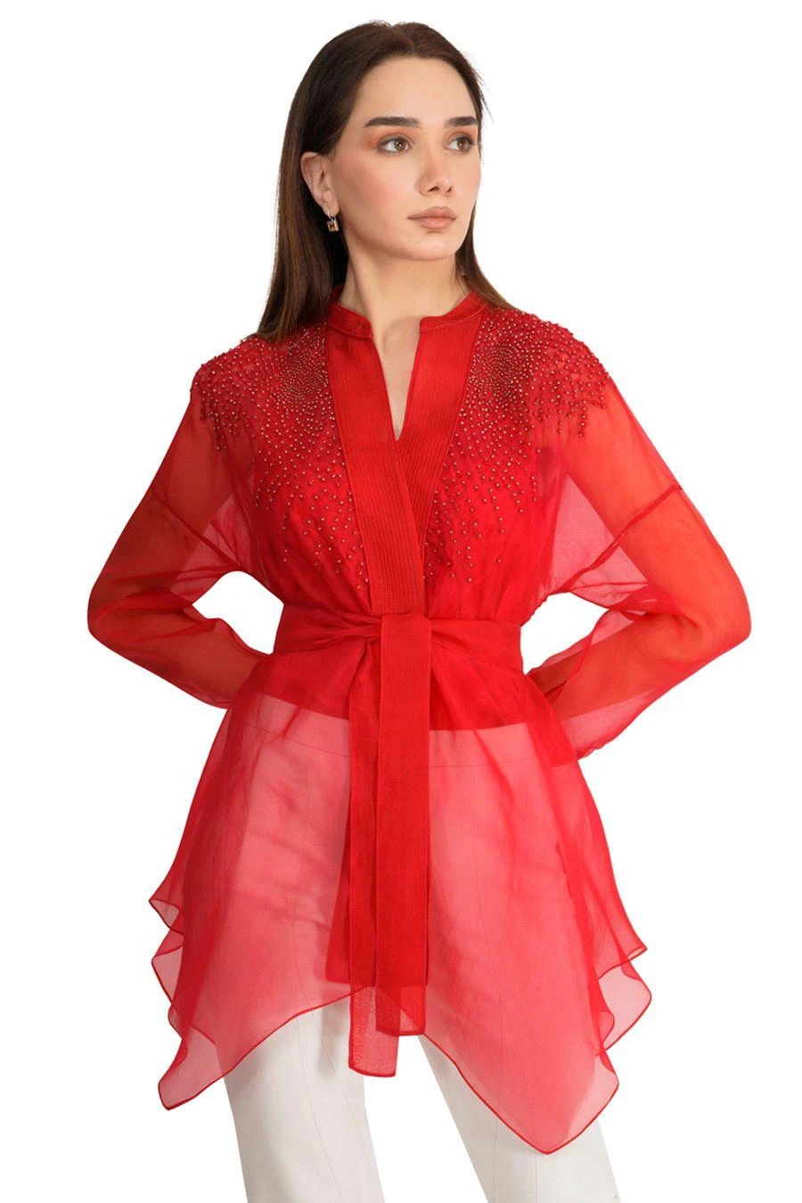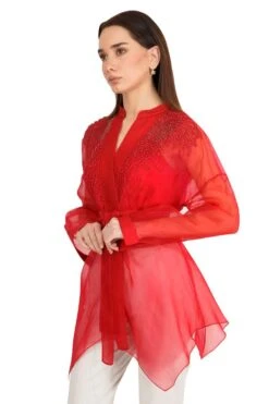 Take your layering game a notch higher with this red jacket. Crafted in organza, this front open top with a belt features metallic bead embroidery at the shoulder.