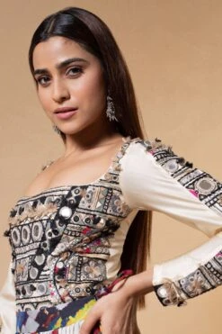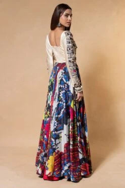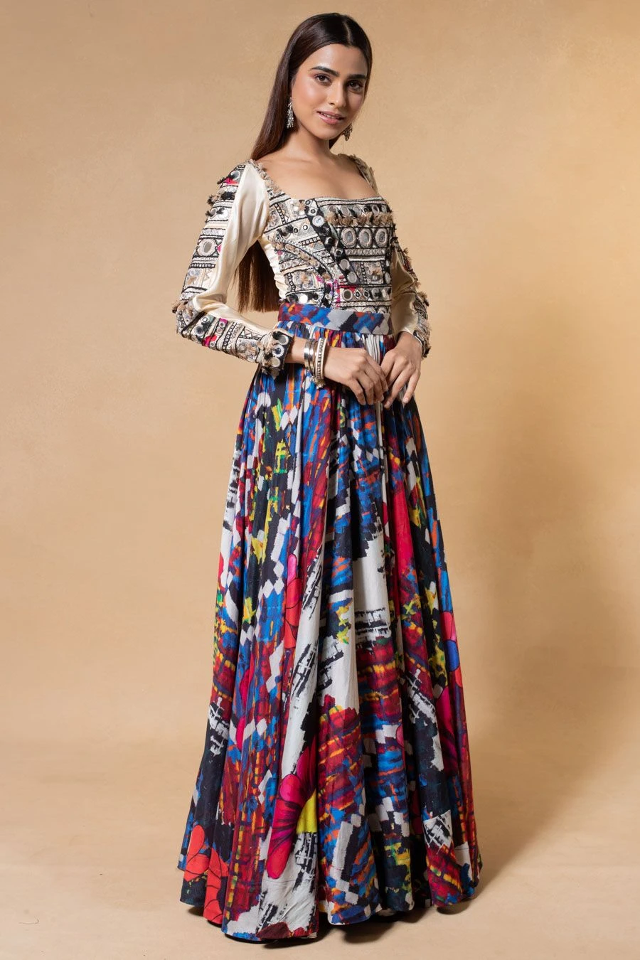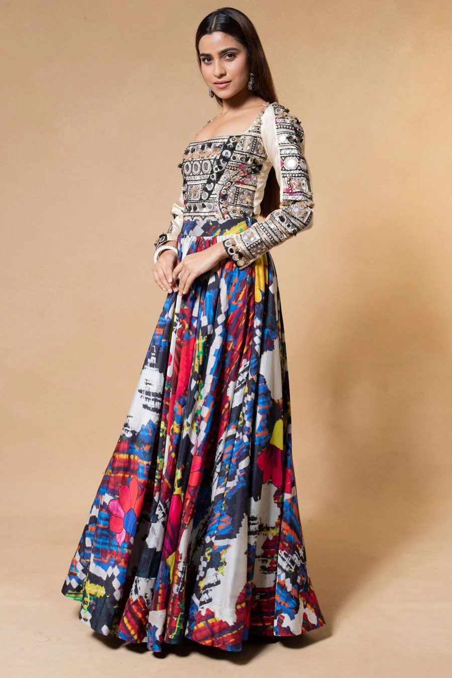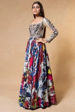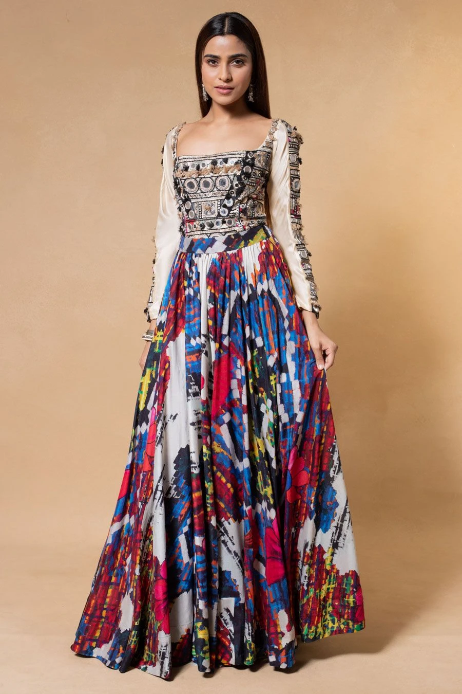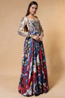 The perfect amalgamationh of style & comfort, this lehenga set is perfect for daytime festivities. Crafted in chiffon & cotton silk, this set features a mirror embellished bodysuit paired with an abstract printed lehenga.
