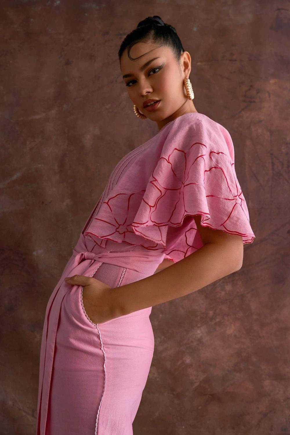 In the realm of elegance, a V-neck jumpsuit emerges, adorned with embroidery & lace details gracing the front & sleeves. Its wide-leg embroidered bottom, featuring delicate lace accents & side slits, weaves a story of timeless sophistication.