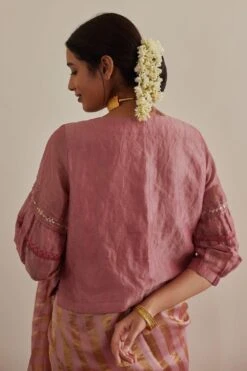Indulge in elegance with this Onion Pink Zohra blouse. Meticulously crafted from Handloom tissue, adorned with delicate embroidery and intricate lace trims, it epitomizes timeless sophistication.
