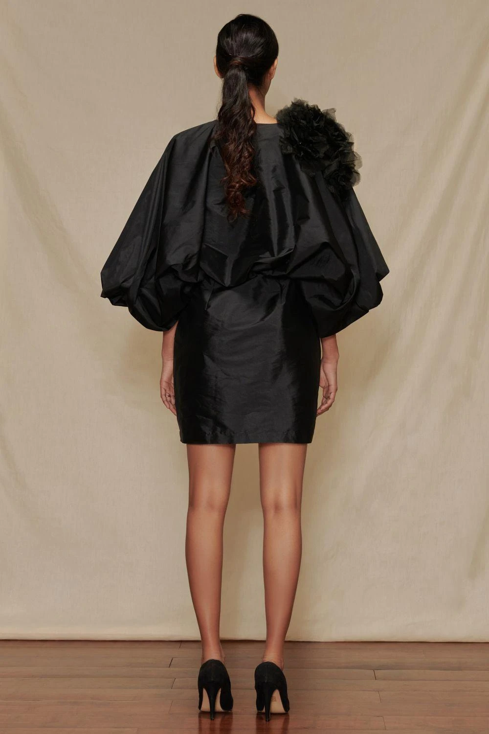 This black mini dress channels equal amounts of elegance & edge, perfect for your evening parties. The bodice of this dress is puffy and accentuated with an extra large flower, while the skirt is kept sleek. Style it with a pair of black high heels.