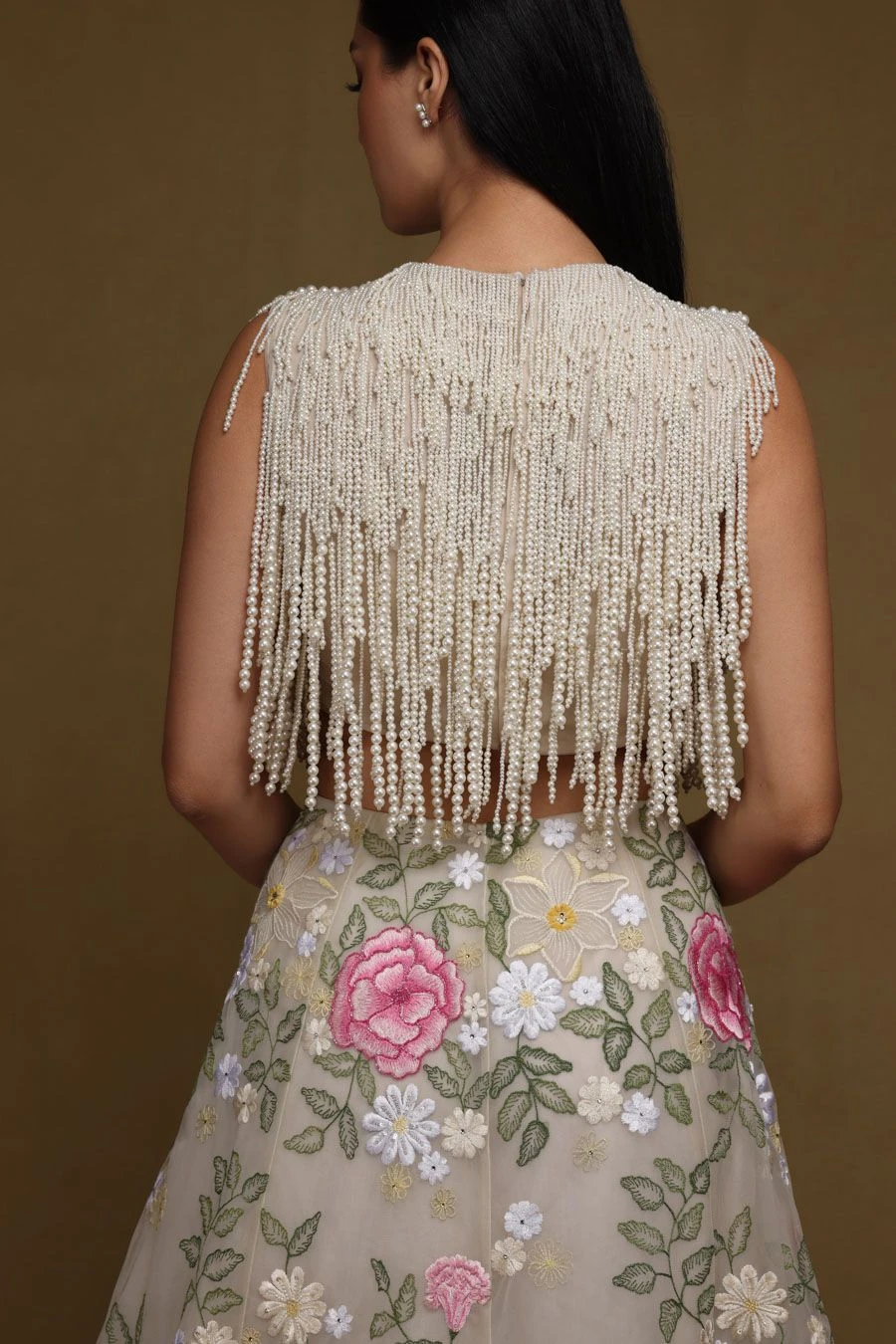Embrace the epitome of glamour with this pearl fringe blouse. Adorned with cascading strands of lustrous pearls, this exquisite piece creates an enchanting movement. The delicate fusion of elegance and texture exudes opulence.