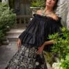This A- line bunch floral skirt set features a tulle base floral embroidered skirt, paired with an off-shoulder bunch floral blouse with crystal detailing & multi layered ruffle dupatta.
