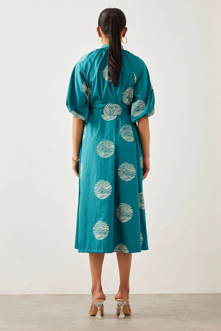 From your work desk to the brunch table & from lounging at home to catching flights, you can always count on this dress. Crafted in cotton, this ripple print dress features a unique collar with a tie up a belt and voluminous sleeves.