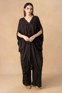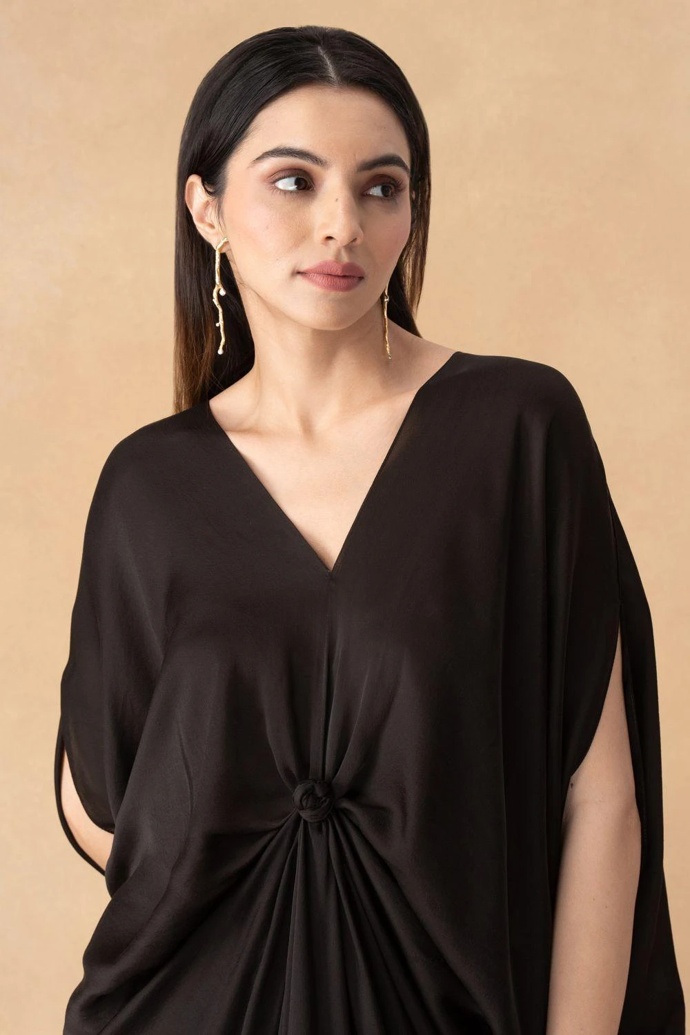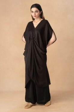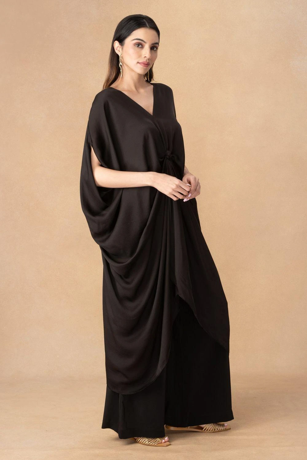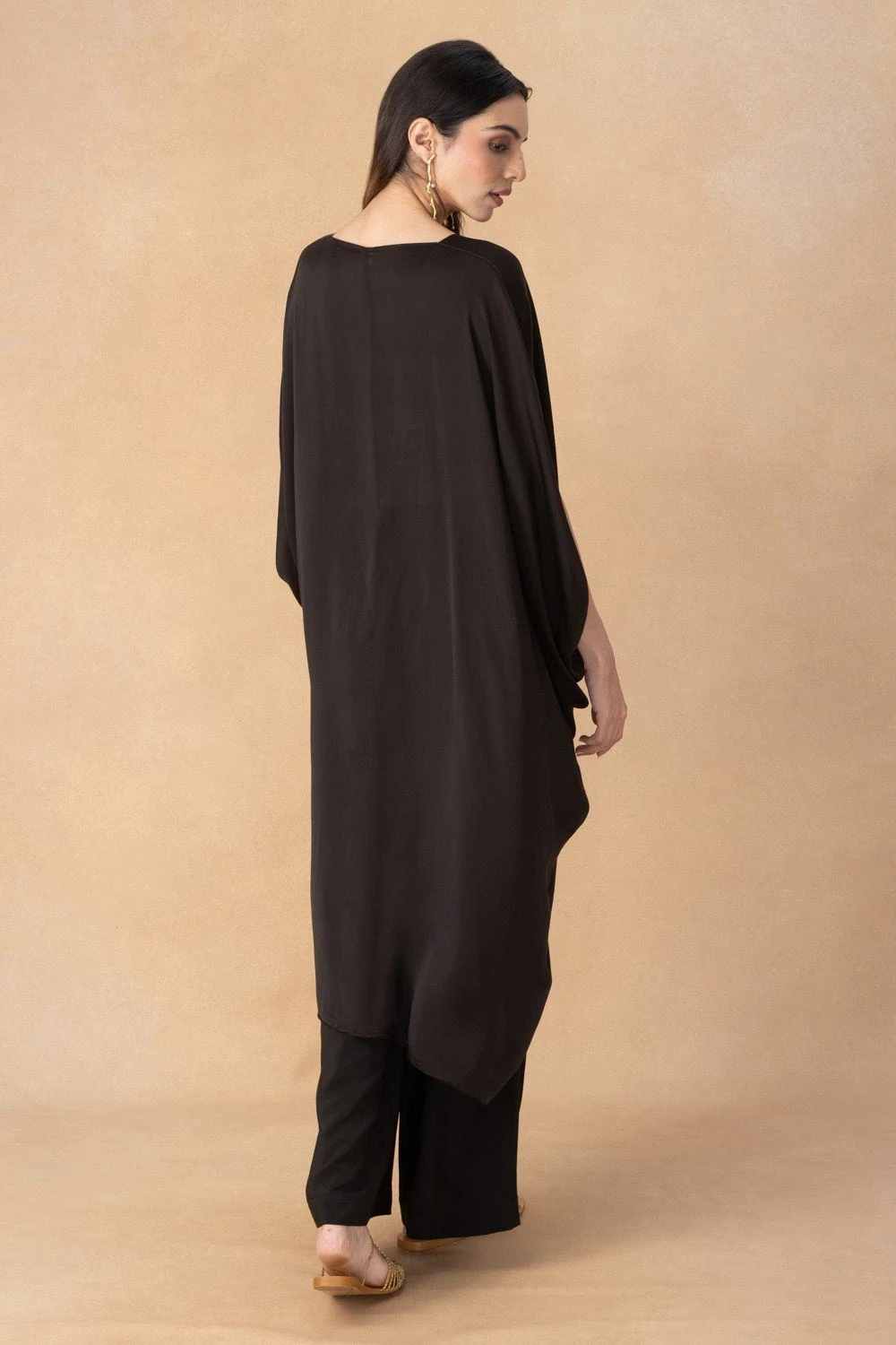 Luxe fabrication & flattering, easy silhouette, make this black tunic set a wardrobe must have. The V-neck tunic is cut in silk satin georgette, while the pants are made in silk crepe. Style this set with a pair of crystal drop earrings.