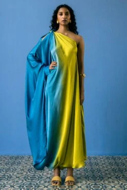 This leheriya toga style dress is consciously crafted in luxe vegan silk, making it trans-seasonal & a statement piece. It is made in a signature ombre hand dye with striking colours. This trend-setting piece can be styled in different ways.