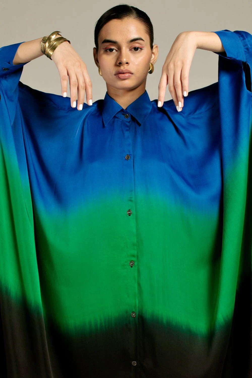 This opulent leheriya kimono dress is carefully crafted in vegan silk. This trans seasonal piece is made in three elegant colours. It features an asymmetric hem & breezy kimono sleeves. Add a pair of statement earrings with this look.