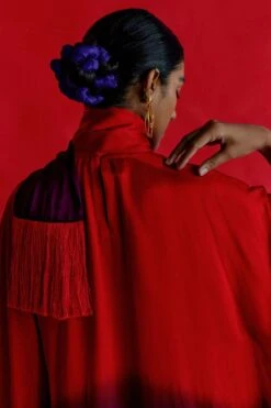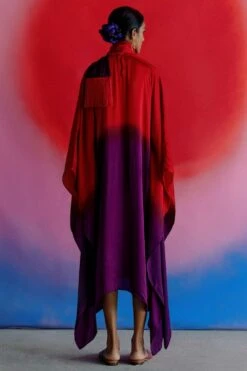 This red & purple leheriya round collar dress is consciously crafted in vegan silk in an elegant ombre palette. This trend-setting piece features kimono sleeves with fringe detailing. It ends above the thigh and drapes on the body.