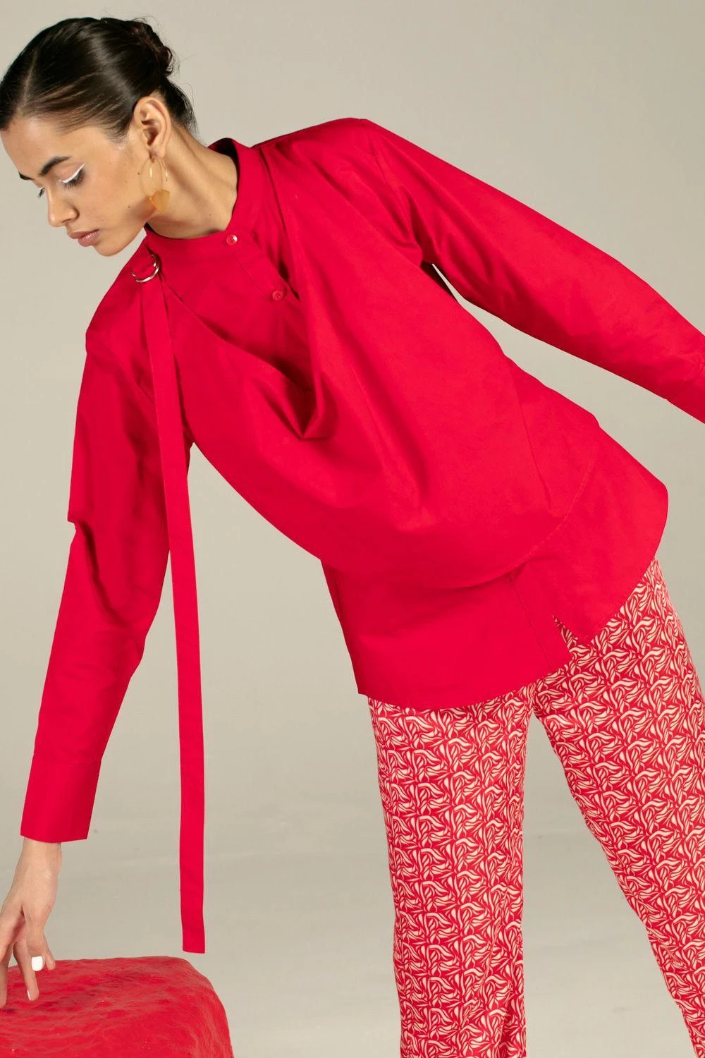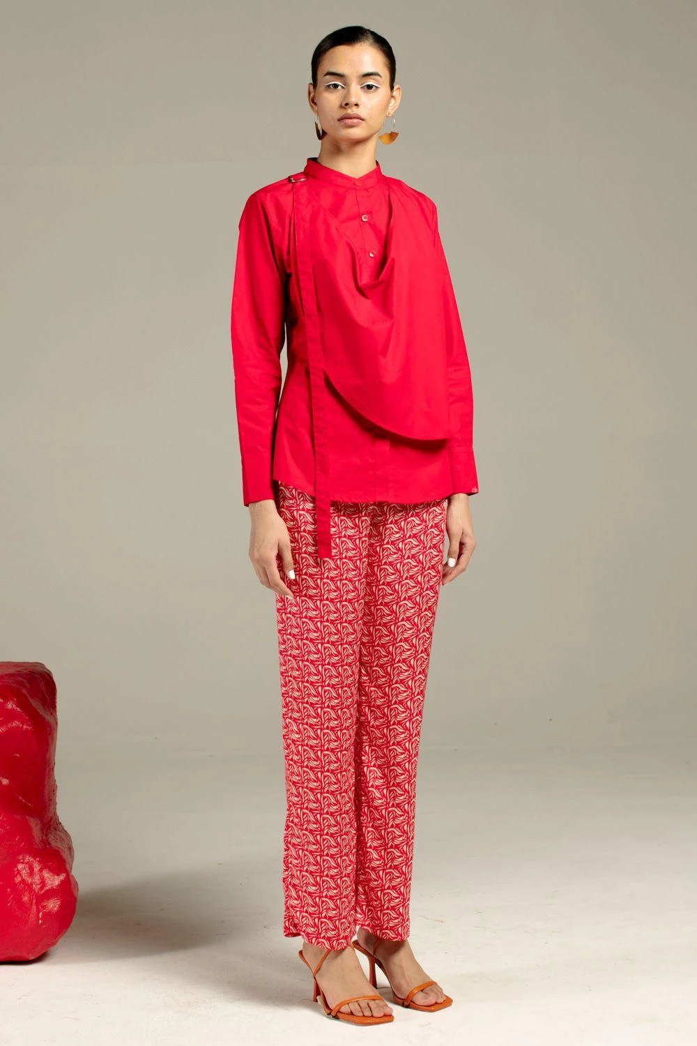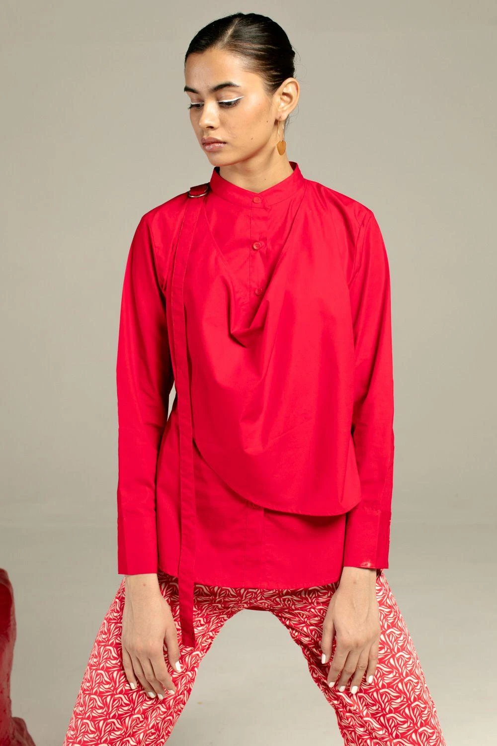 This Serena draped shirt is cut in crisp poplin with an elegant drape on the left. Its versatile fabrication offers the option to dress down with denim or dress up for work.