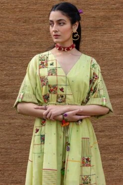Welcome spring in style & comfort with this green dress in muslin textile. It features a wide overlap neck detail with gathers at the waist, featuring a drawstring. The intricate thread embroidery adds a vibrant touch to it.