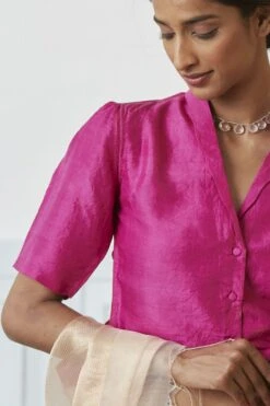 Elevate your style with this pink solid collar shirt blouse, meticulously crafted from handwoven mulberry silk. Its captivating pink hue exudes femininity and sophistication, while the exquisite craftsmanship ensures a luxurious feel.
