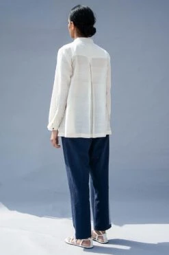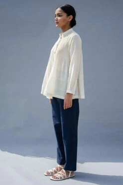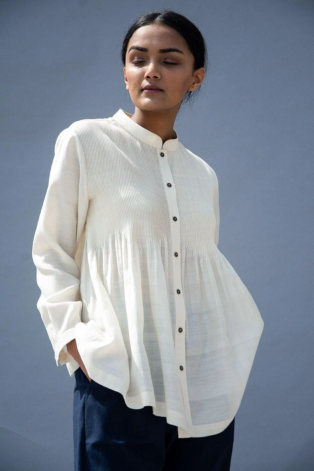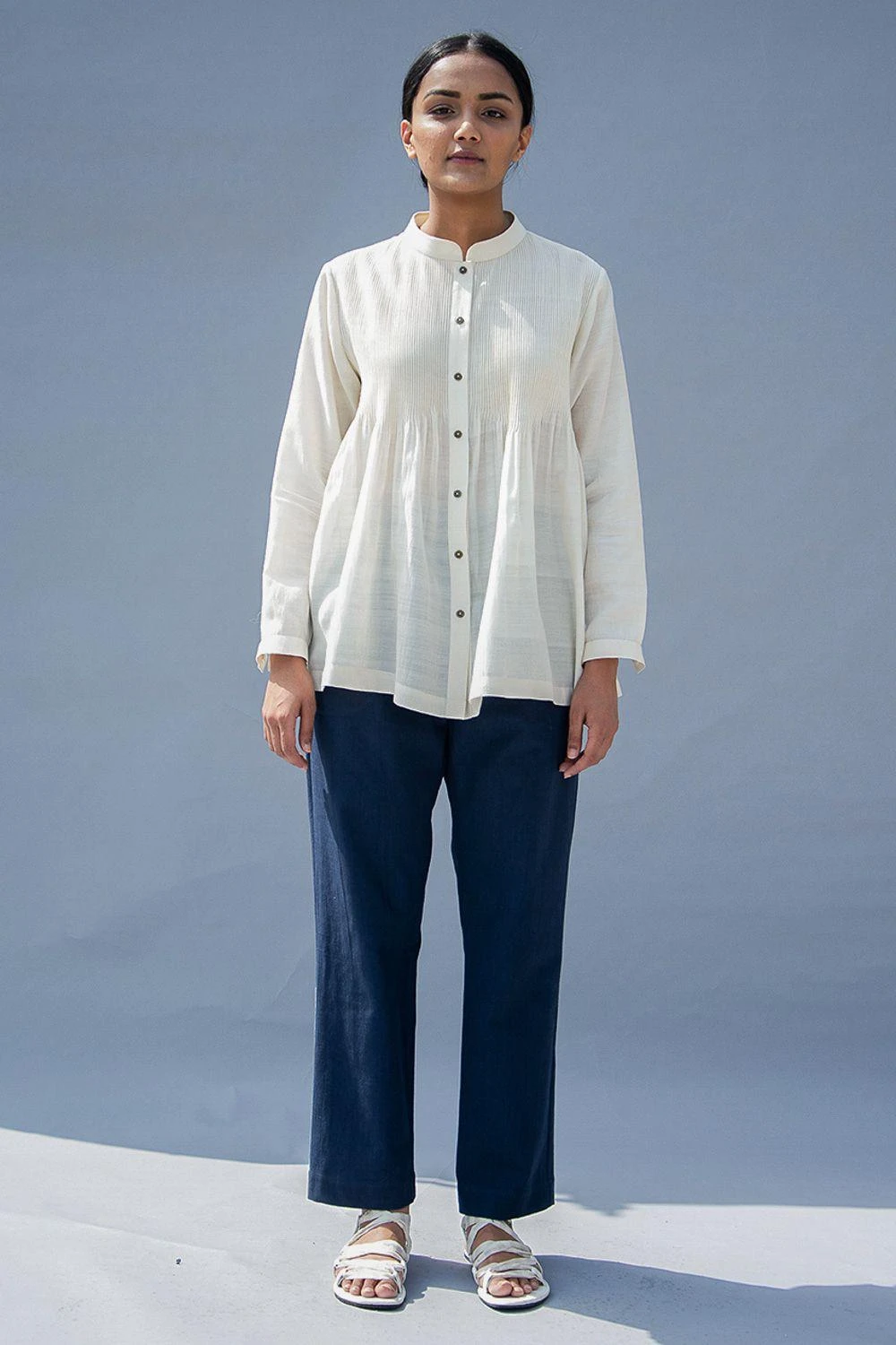 This ivory shirt is made in 100% hand woven yarn dyed cotton in an airy silhouette, ideal for the balmy days. It features fine pintuck details down the yoke. You can style this breezy piece with a pair of denim shorts or jeans.