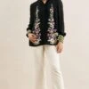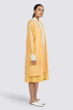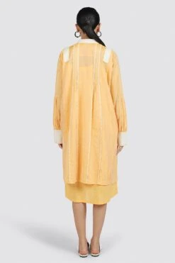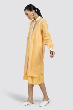 The broad crochet placket and cuffs of this long handwoven chanderi shirt make a bold statement. Accessorize this well and you have a real stand out piece.