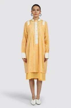 The broad crochet placket and cuffs of this long handwoven chanderi shirt make a bold statement. Accessorize this well and you have a real stand out piece.