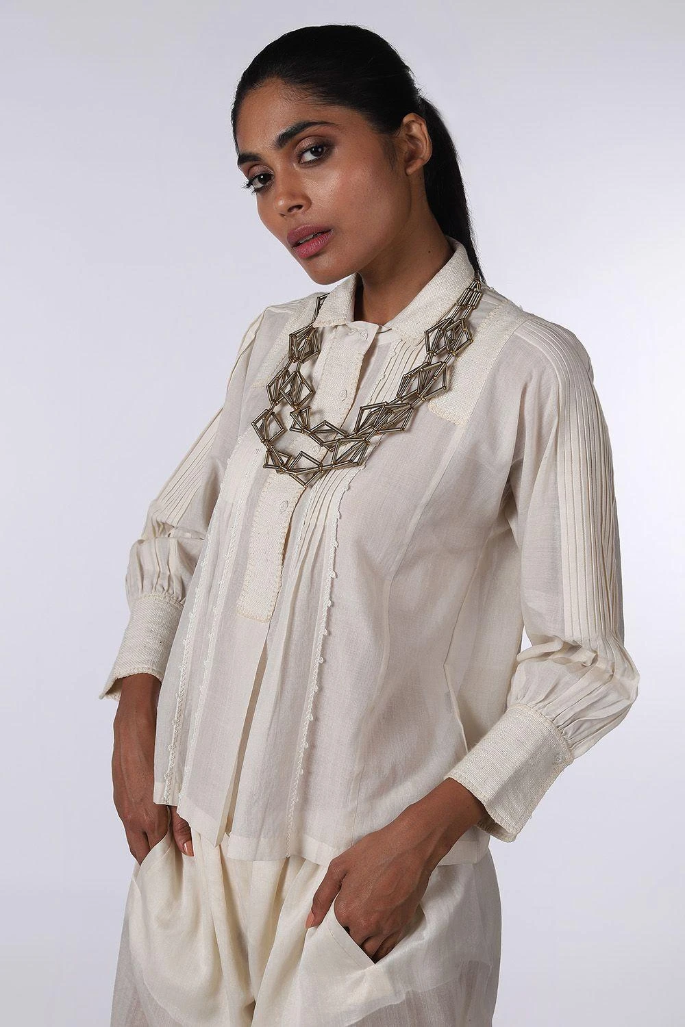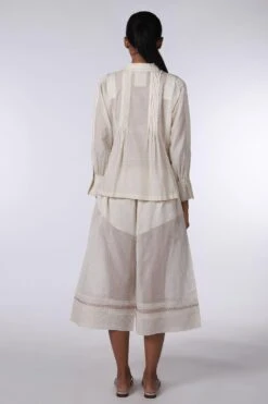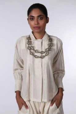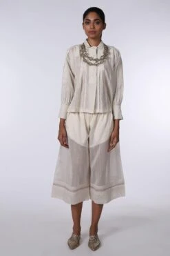 This straight shirt, crafted out of handwoven chanderi and Bengal khadi is the perfect option for hot summer days. The hand crochet adds a touch of softness.