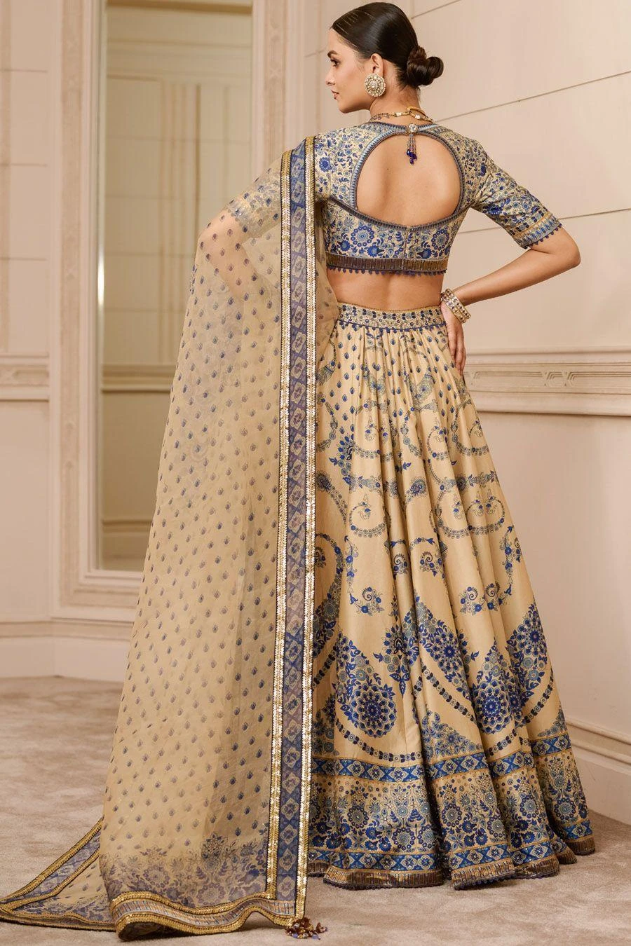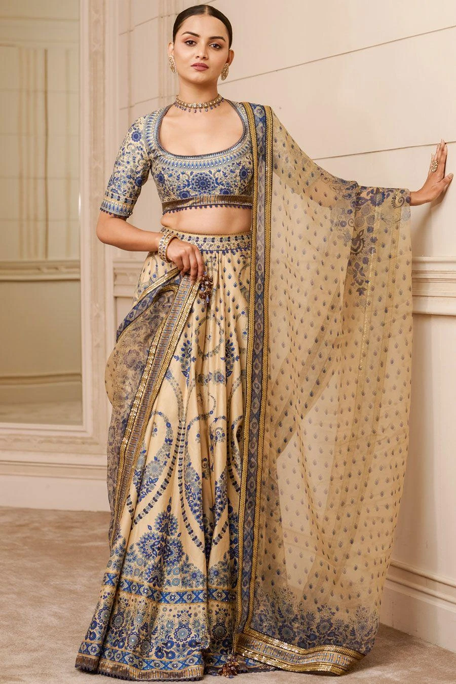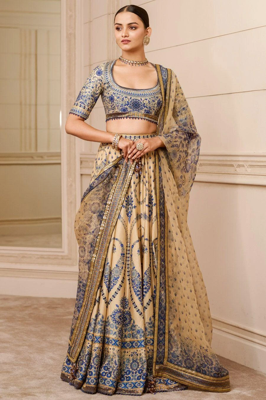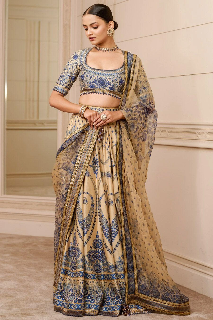 This printed lehenga in chanderi is laced with embellished borders, it is offset with a classic printed blouse, along with a printed sheer silk dupatta with gold borders. Add a pair of statement earrings to complete the look.