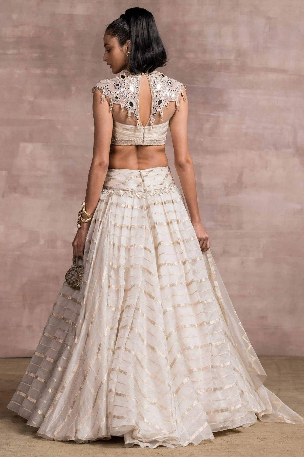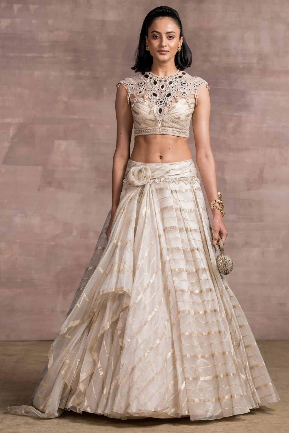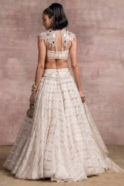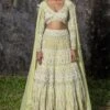 For the modern day brides, this ivory drape lehenga set is perfect for a stand out look. It features a brocade ivory & gold cascading lehenga paired with a sheer neck blouse detailed with resham & mirror work. The set comes with a sheer silk stole.