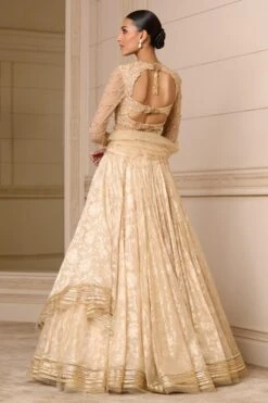 This striped chanderi lehenga with a front drape is uplifted with gota borders. It is offset with a hand-embroidered jewelled blouse in georgette with sheer sleeves, highlighted with crystals. Also given is a crystallised draped scarf in tulle.