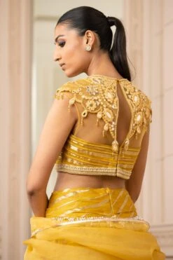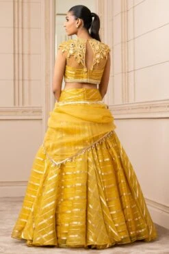 For the modern day brides, this mustard drape lehenga set is perfect for a stand out look. It features a brocade cascading lehenga with pearl waist, paired with a sheer neck blouse detailed with resham & mirror work and a sheer silk stole.