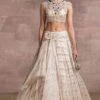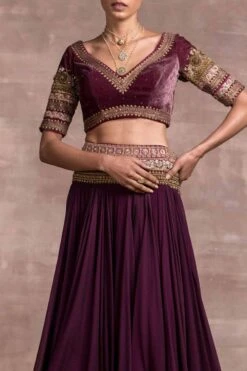 An unconventional choice for a wedding outfit, this draped lehenga in shot chiffon fabric is perfect to put you in the spotlight. It is designed with an embroidered hip yoke and comes with a matching hand-embroidered velvet blouse and a dupatta.